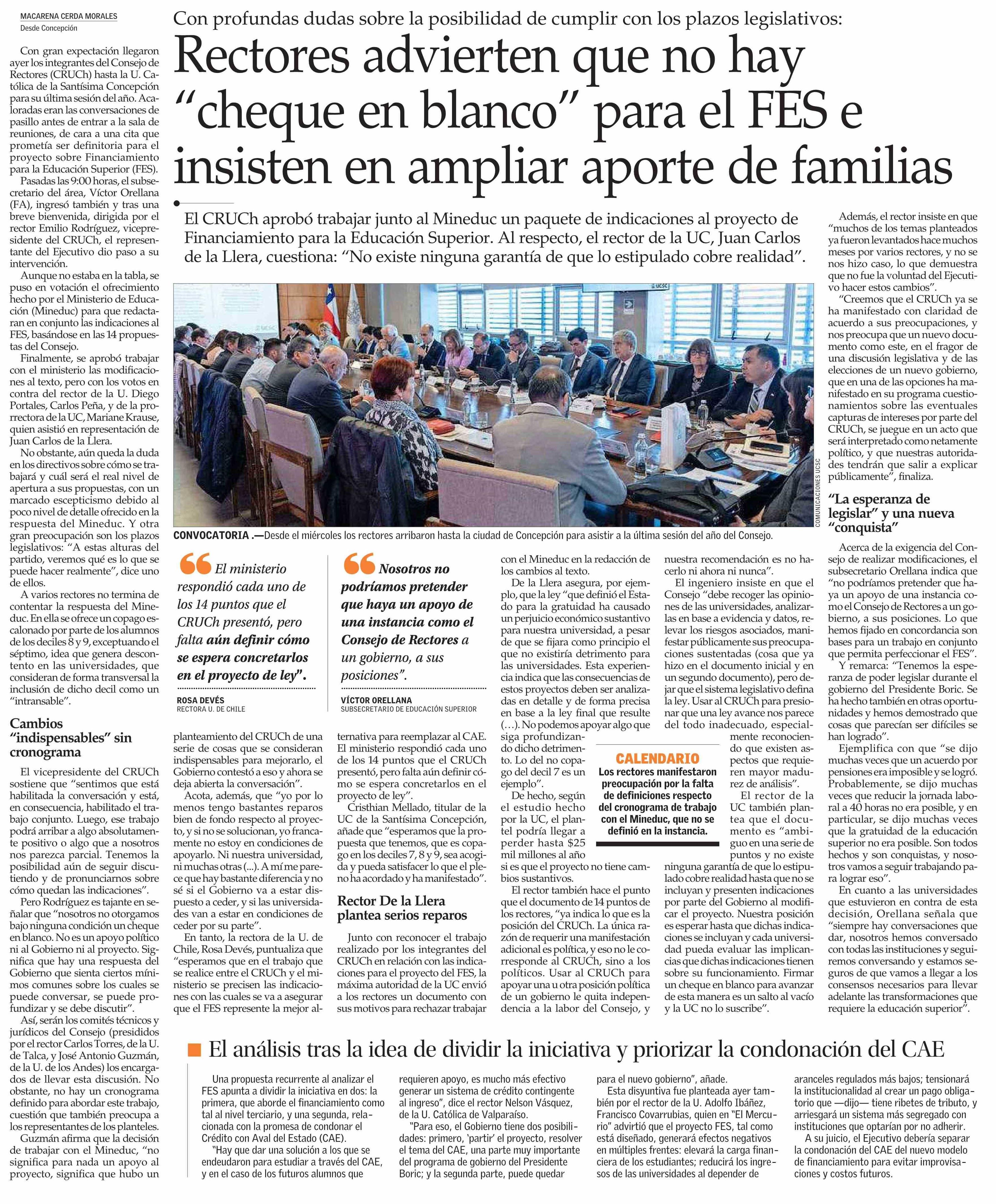 Rectores advierten que no hay “cheque en blanco” para el FES e insisten en ampliar aporte de familias