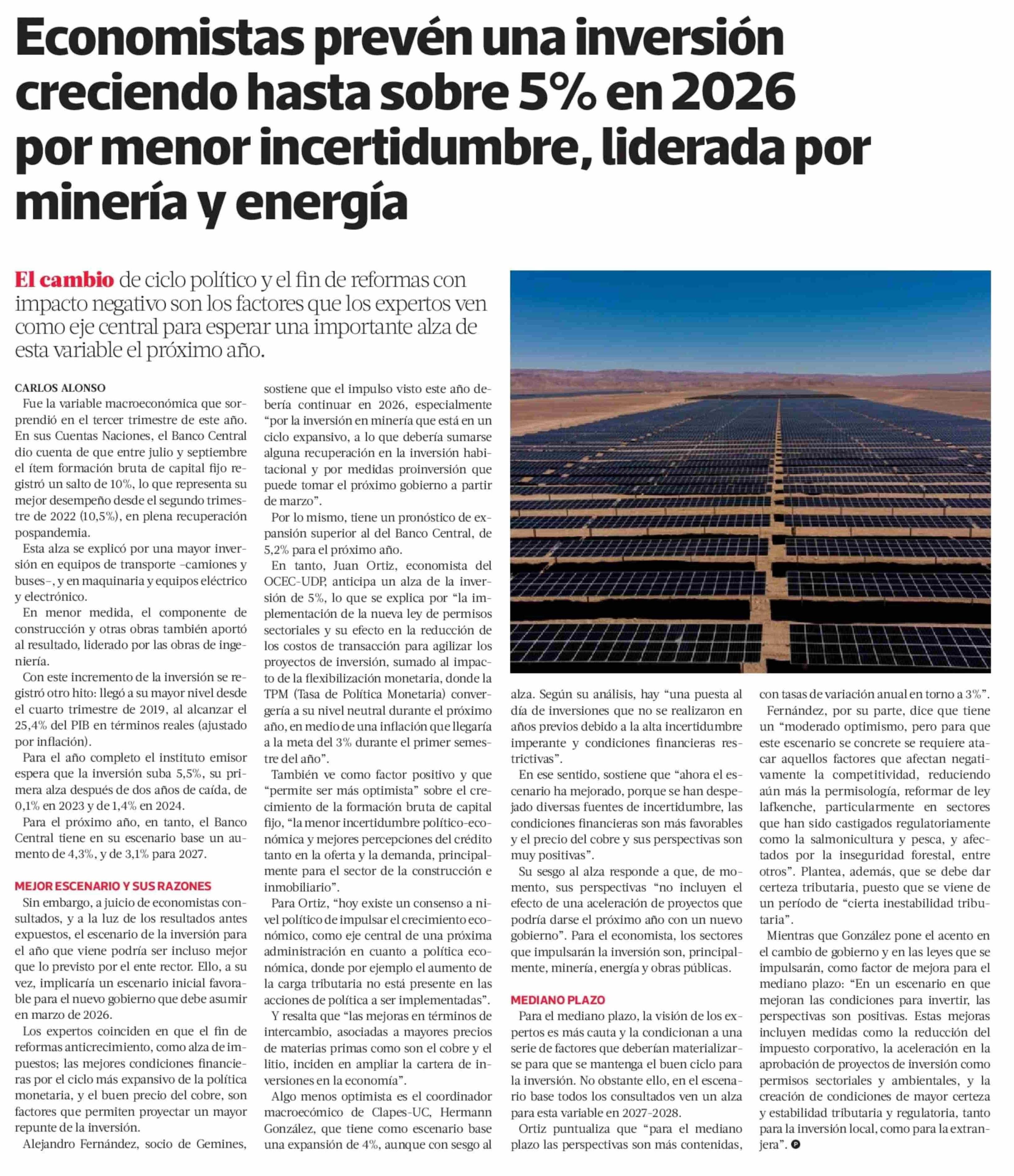 Economistas prevén una inversión creciendo hasta sobre 5% en 2026 por menor incertidumbre, liderada por minería y energía