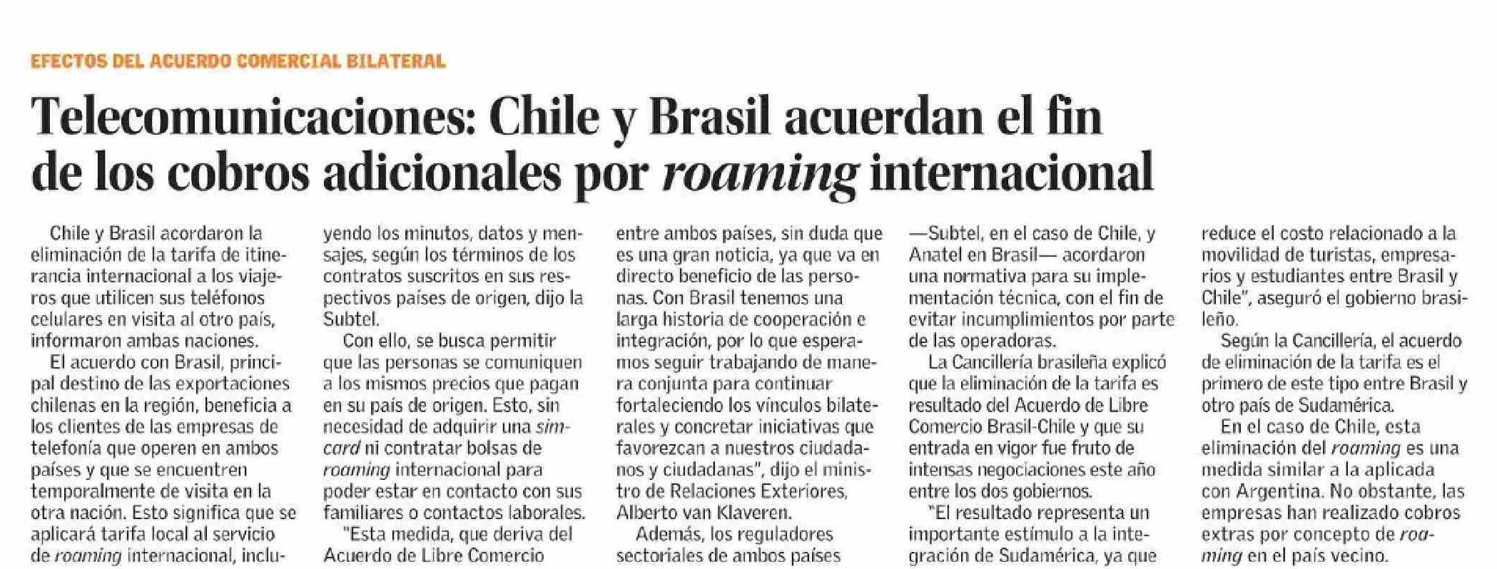 Chile y Brasil acuerdan el fin de los cobros adicionales por roaming internacional