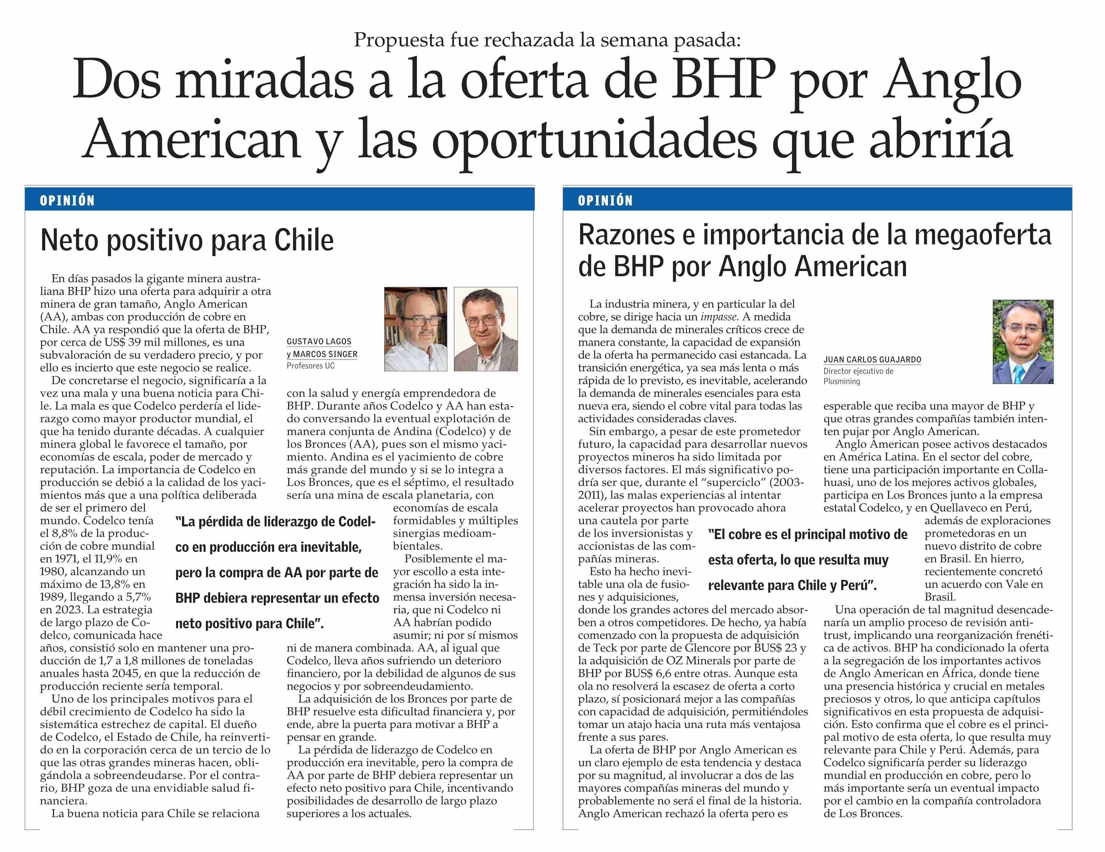 Dos miradas a la oferta de BHP por Anglo American y las oportunidades que abriría
