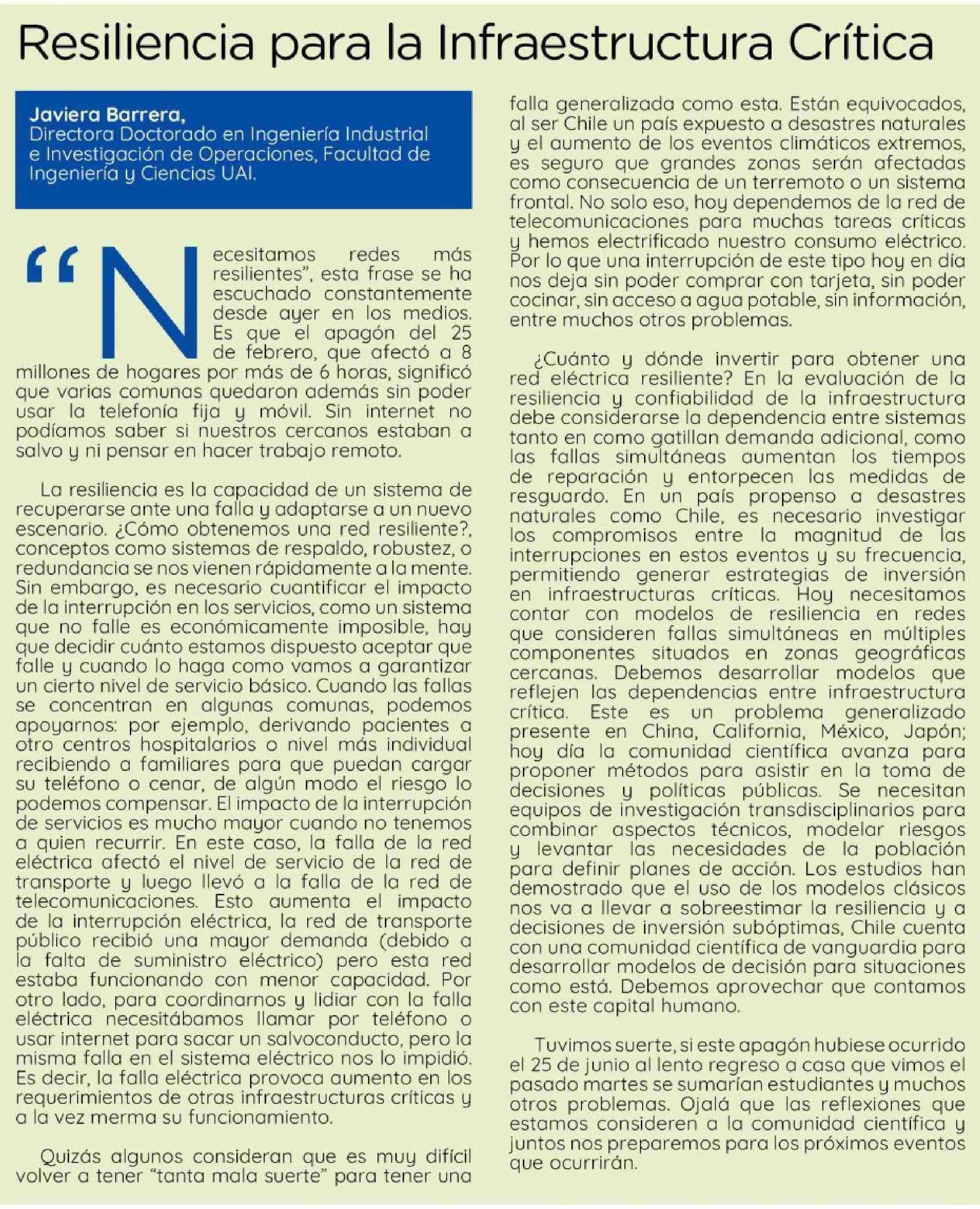 Columnas de Opinión: Resiliencia para la Infraestructura Crítica