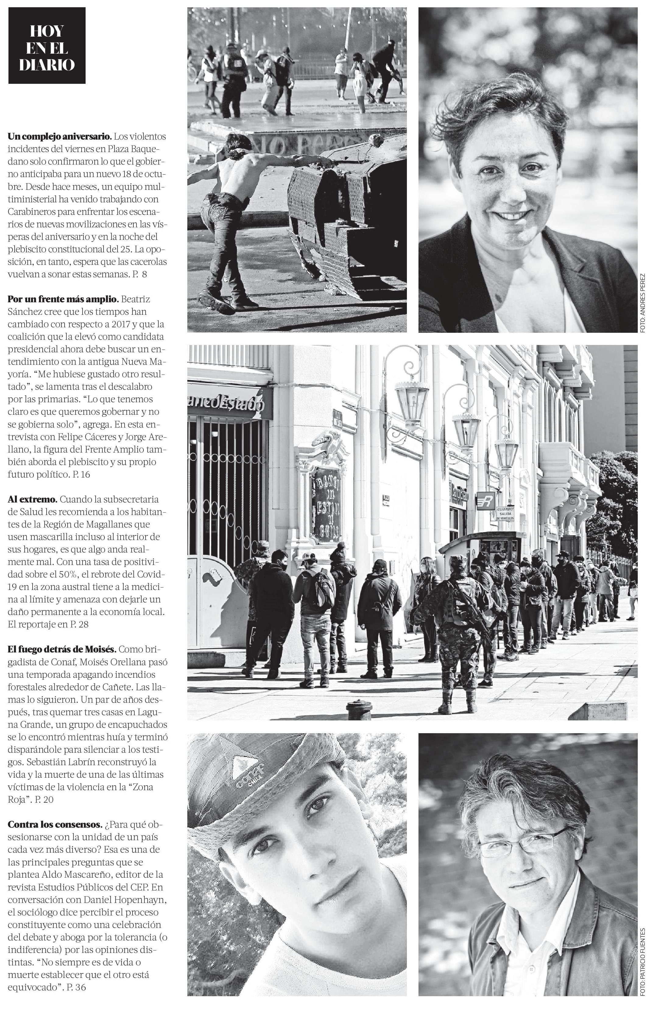 HOY EN EL DIARIO 11/10/2020 La Tercera HOY EN EL DIARIO Un complejo aniversario. Los violentos incidentes del viernes en Plaza Baquedano solo confirmaron lo que el gobierno anticipaba para un nuevo 18 de octubre. Desde... |