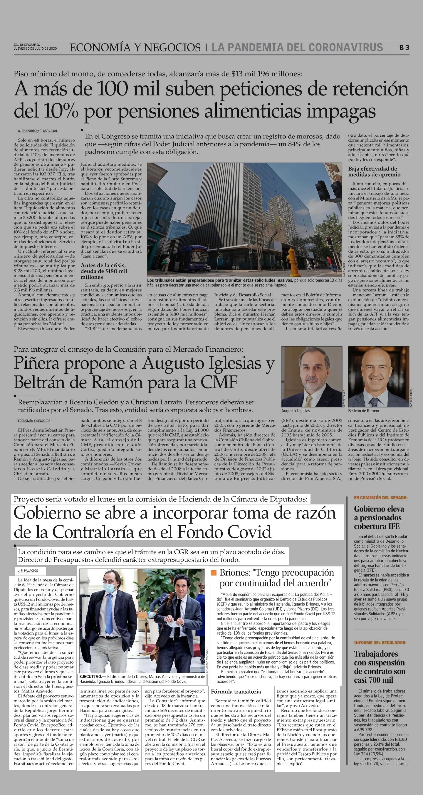 Gobierno se abre a incorporar toma de razón de la Contraloría en el Fondo Covid 30/07/2020 El Mercurio Proyecto sería votado el lunes en la comisión de Hacienda de la Cámara de Diputados: Gobierno se abre a incorporar toma de razón de la Contraloría en el Fondo Covid La condición pa... |