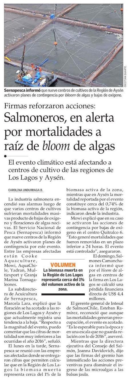 Salmoneros, en alerta por mortalidades a raíz de bloom de algas