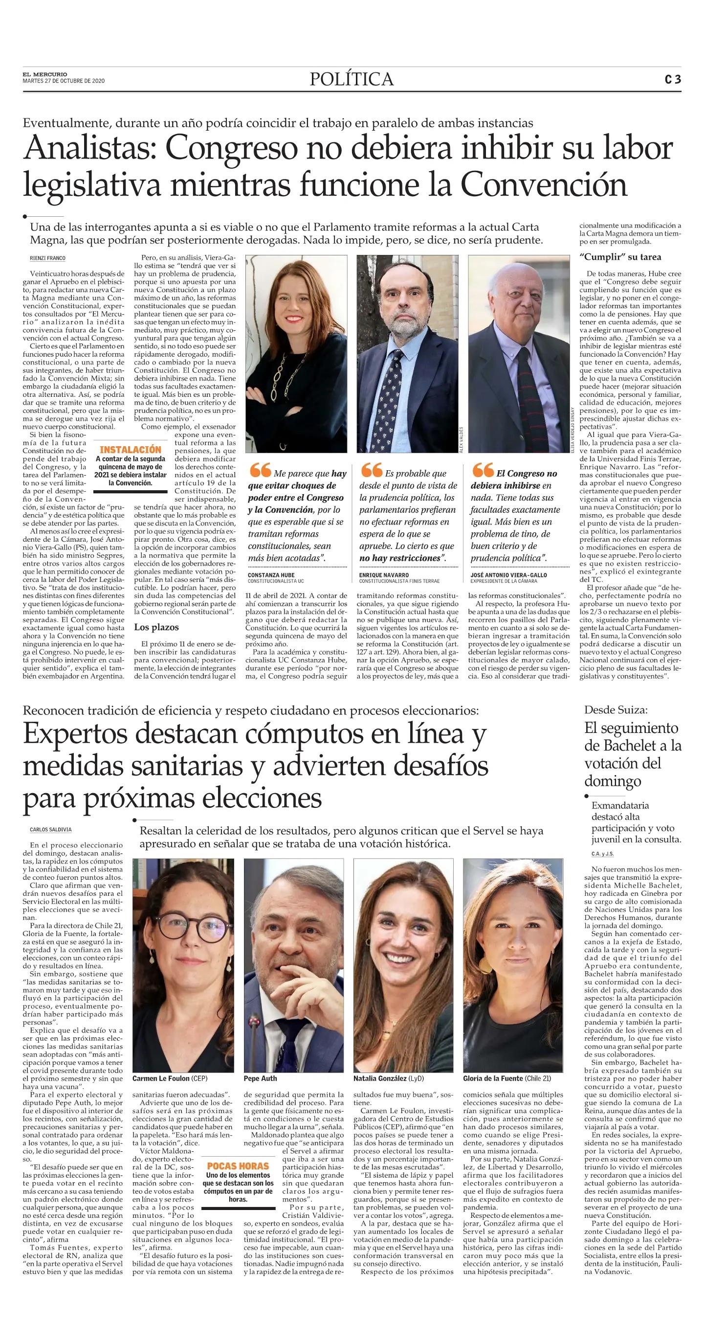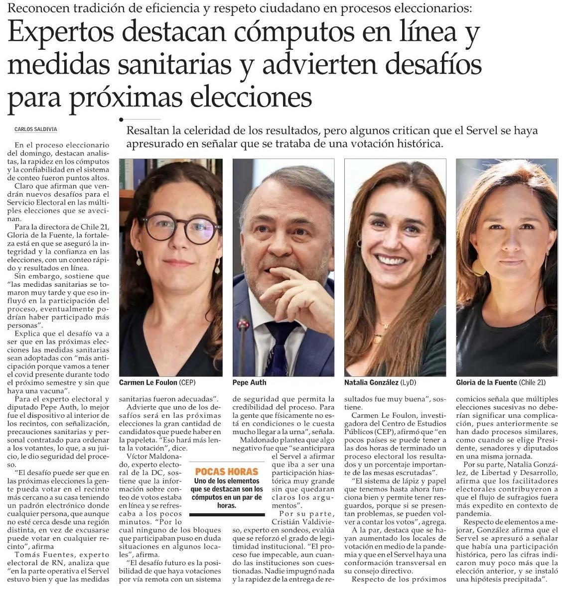 Expertos destacan cómputos en línea y medidas sanitarias y advierten desafíos para próximas elecciones 27/10/2020 El Mercurio Reconocen tradición de eficiencia y respeto ciudadano en procesos eleccionarios: Expertos destacan cómputos en línea y medidas sanitarias y advierten desafíos para próximas elecciones... |