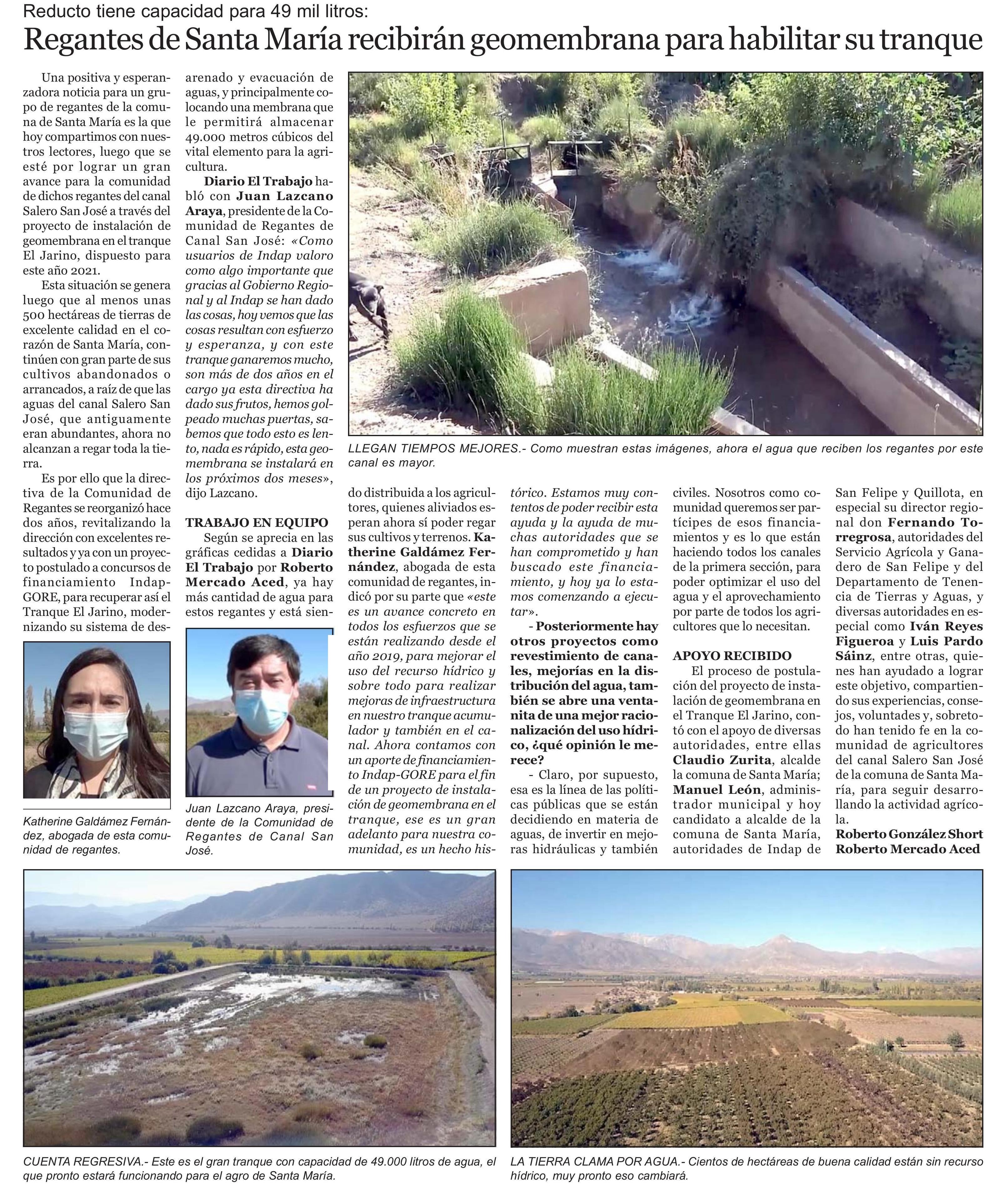 Regantes de Santa María recibirán geomembrana para habilitar su tranque 30-04-2021 El Trabajo |