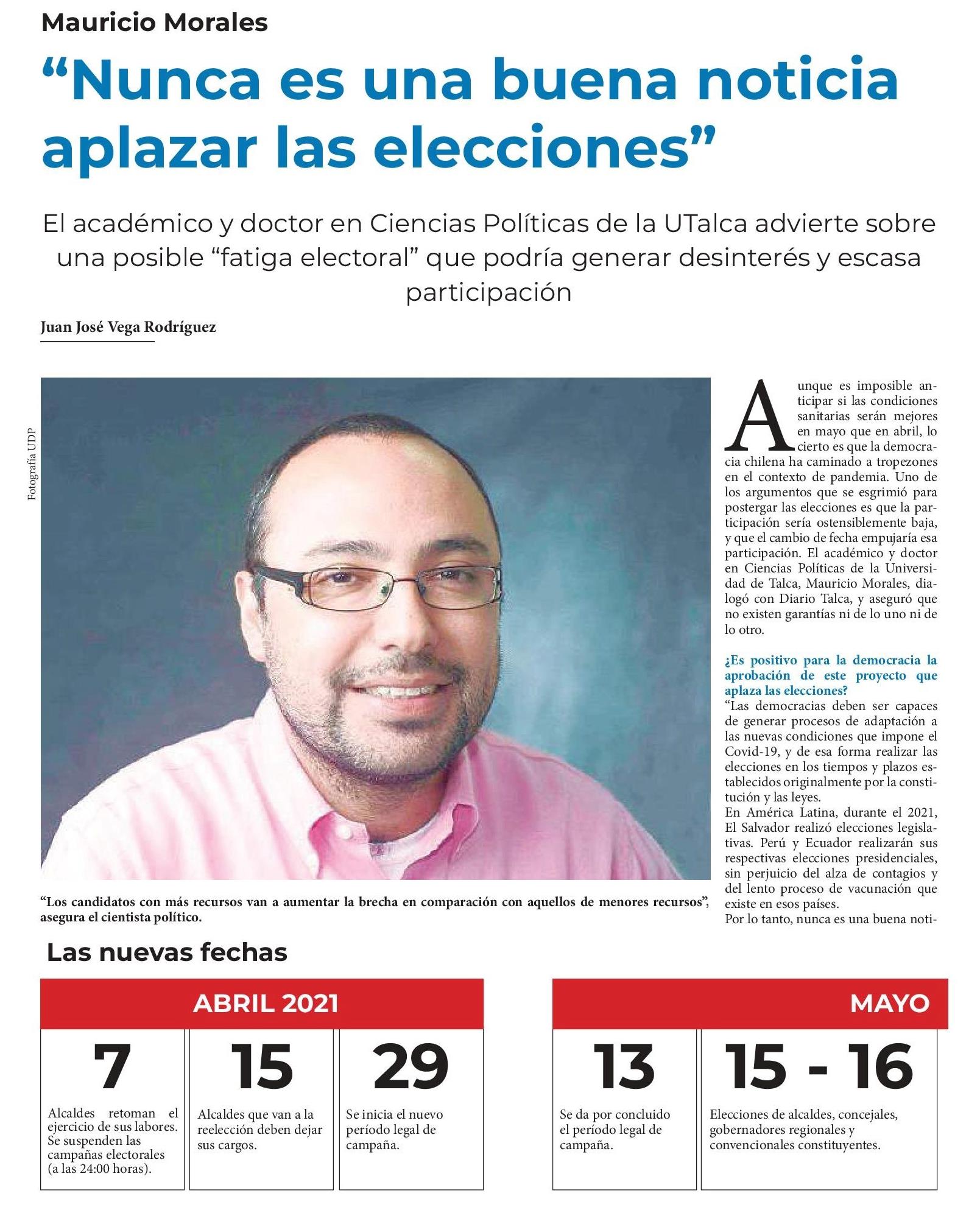 “Nunca es una buena noticia aplazar las elecciones” 17-04-2021 Diario Talca |