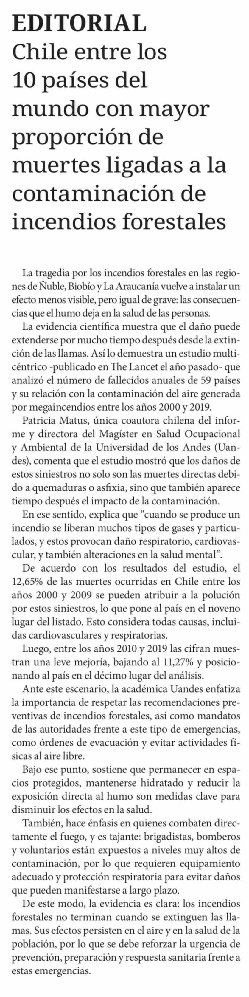 Editorial: EDITORIAL Chile entre los 10 países del mundo con mayor proporción de muertes ligadas a la contaminación de incendios forestales 21-02-2026 Diario Chañarcillo |