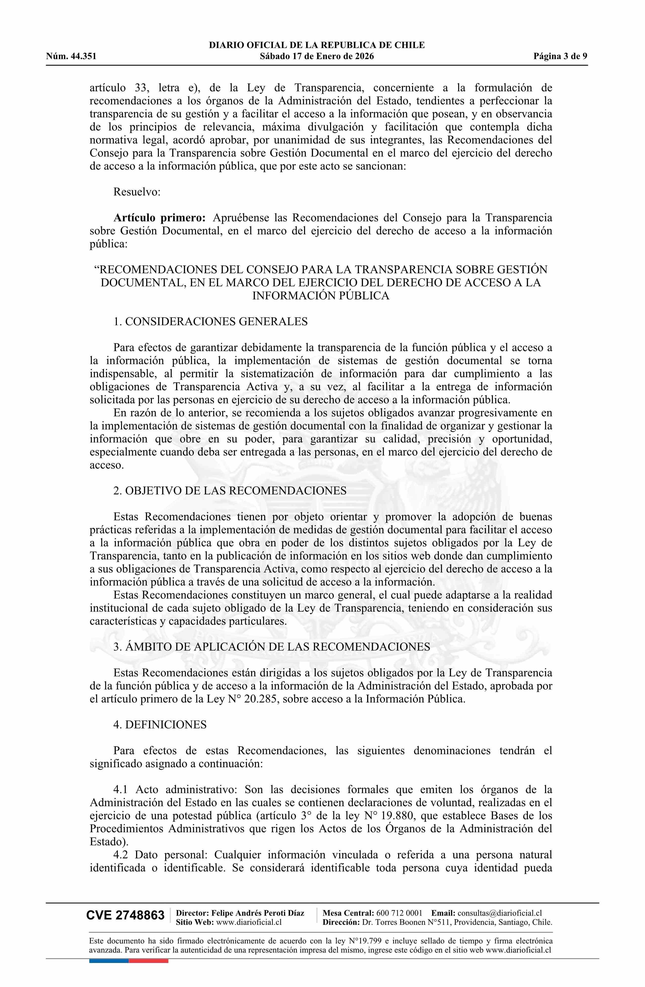 | Título: | Resolución exenta número E891, de 2025.- Aprueba texto de las recomendaciones del Consejo para la Transparencia sobre Gestión Documental en el marco del ejercicio del derecho de acceso a la información pública |