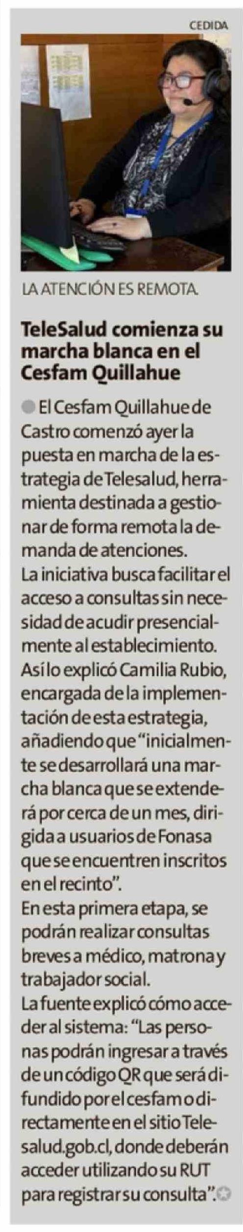 | Título: | TeleSalud comienza su marcha blanca en el Cesfam Quillahue |