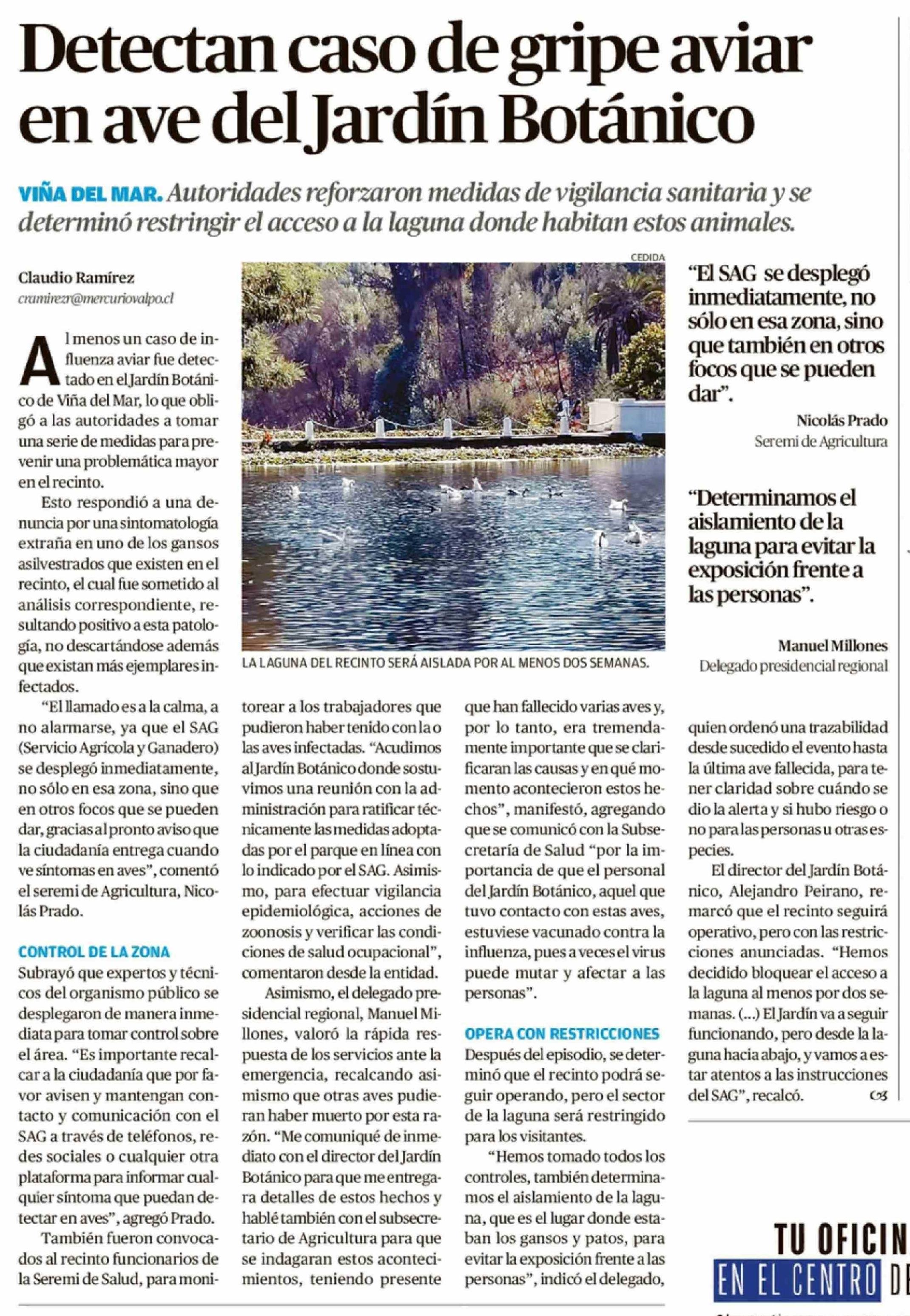 Detectan caso de gripe aviar en ave del Jardín Botánico 11-04-2026 El Mercurio de Valparaíso |