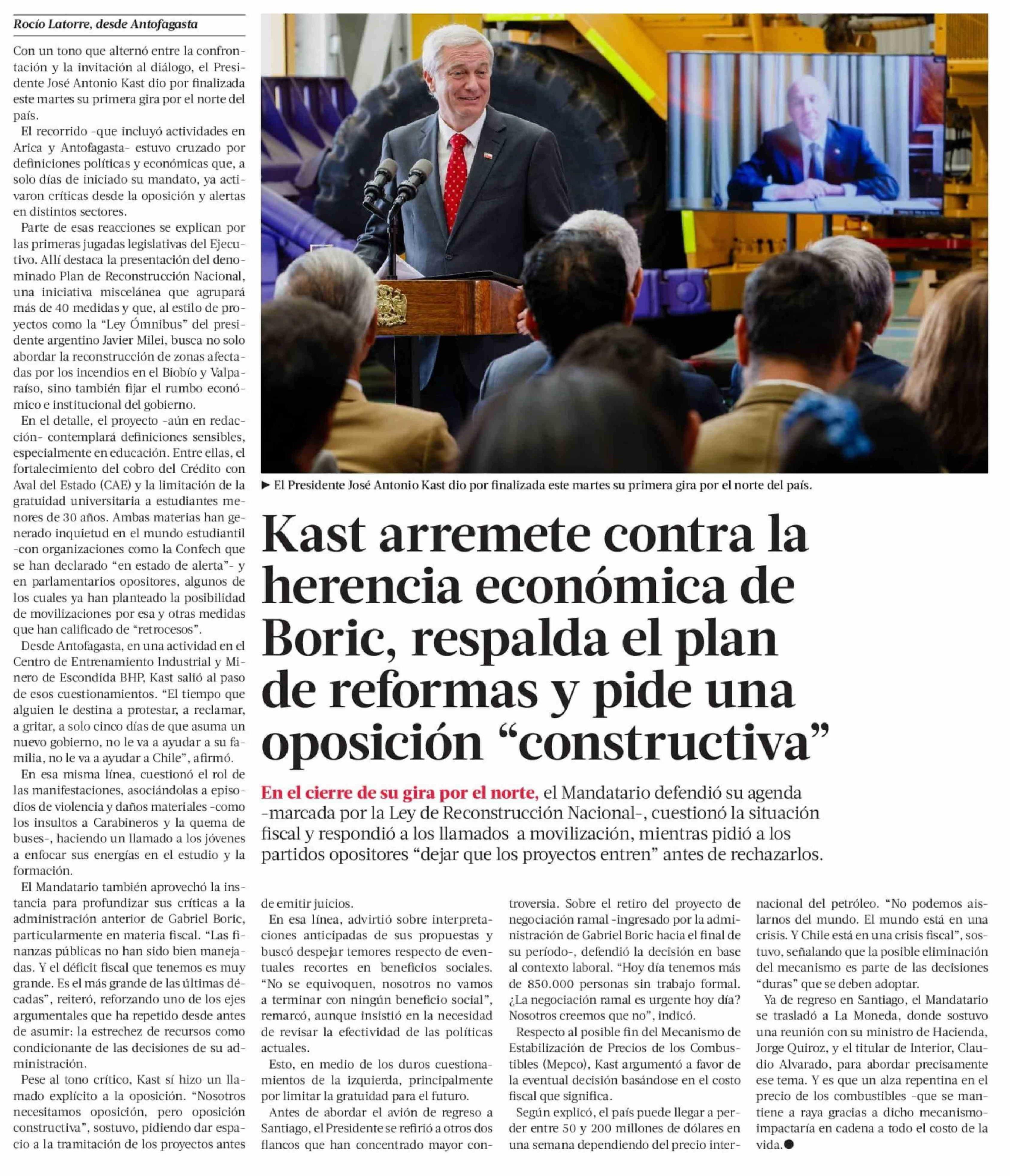 Título: Kast arremete contra la herencia económica de Boric, respalda el plan de reformas y pide una oposición "constructiva"