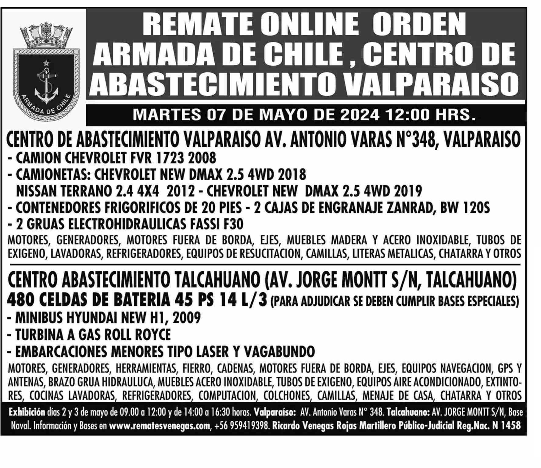 REMATES: REMATE ONLINE ORDEN ARMADA DE CHILE, CENTRO DE ABASTECIMIENTO VALPARAISO 28-04-2024 Las Últimas Noticias |
