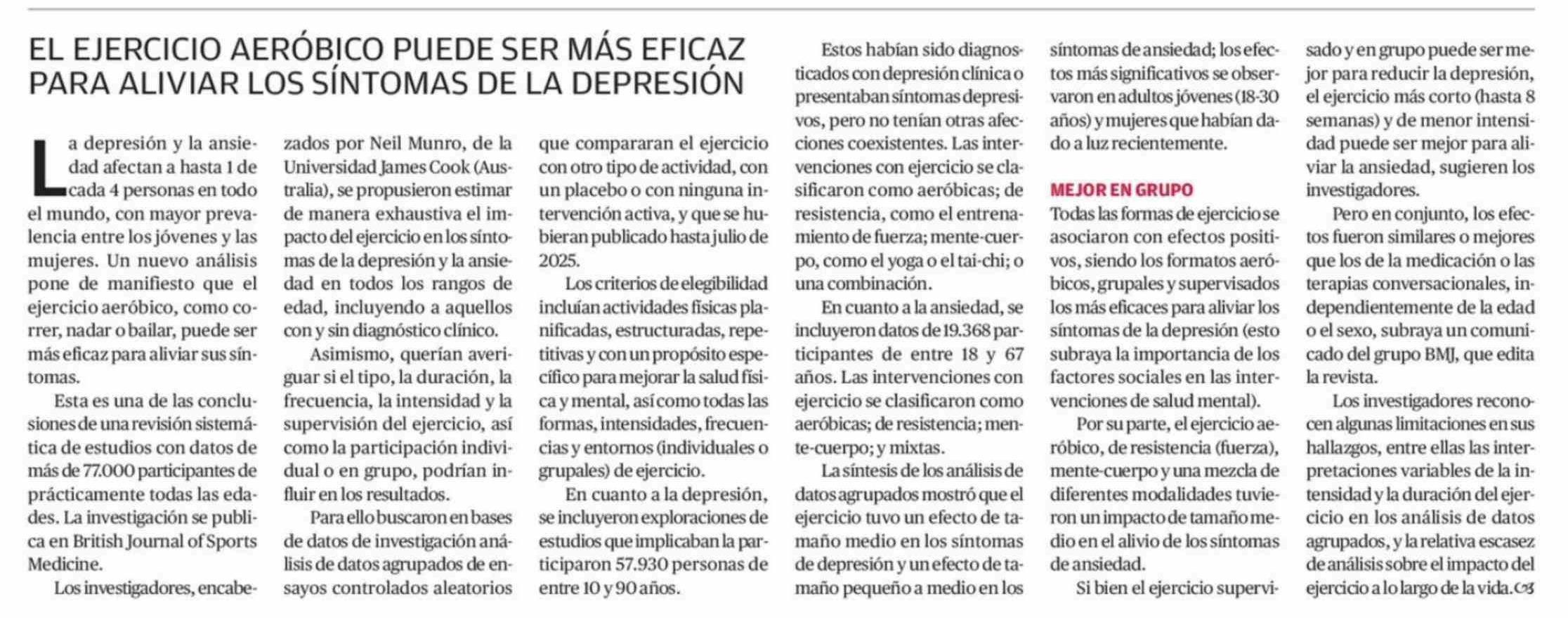 EL EJERCICIO AERÓBICO PUEDE SER MÁS EFICAZ PARA ALIVIAR LOS SÍNTOMAS DE LA DEPRESIÓN 01-03-2026 Crónica de Chillán |
