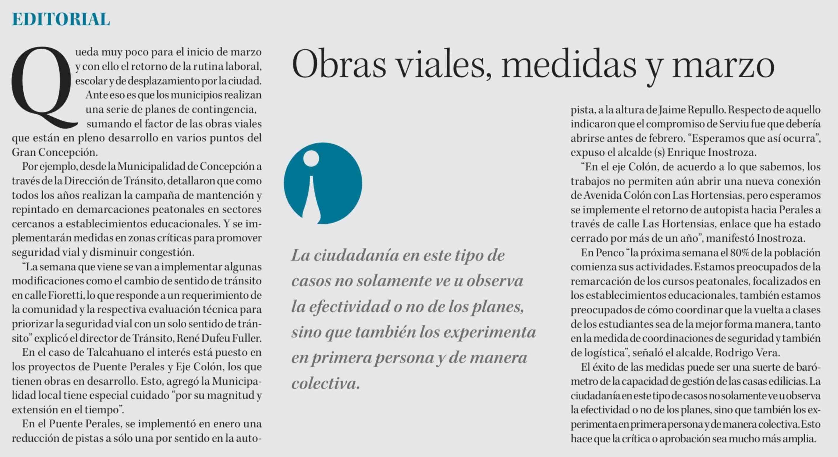 Título: Editorial: Obras viales, medidas y marzo