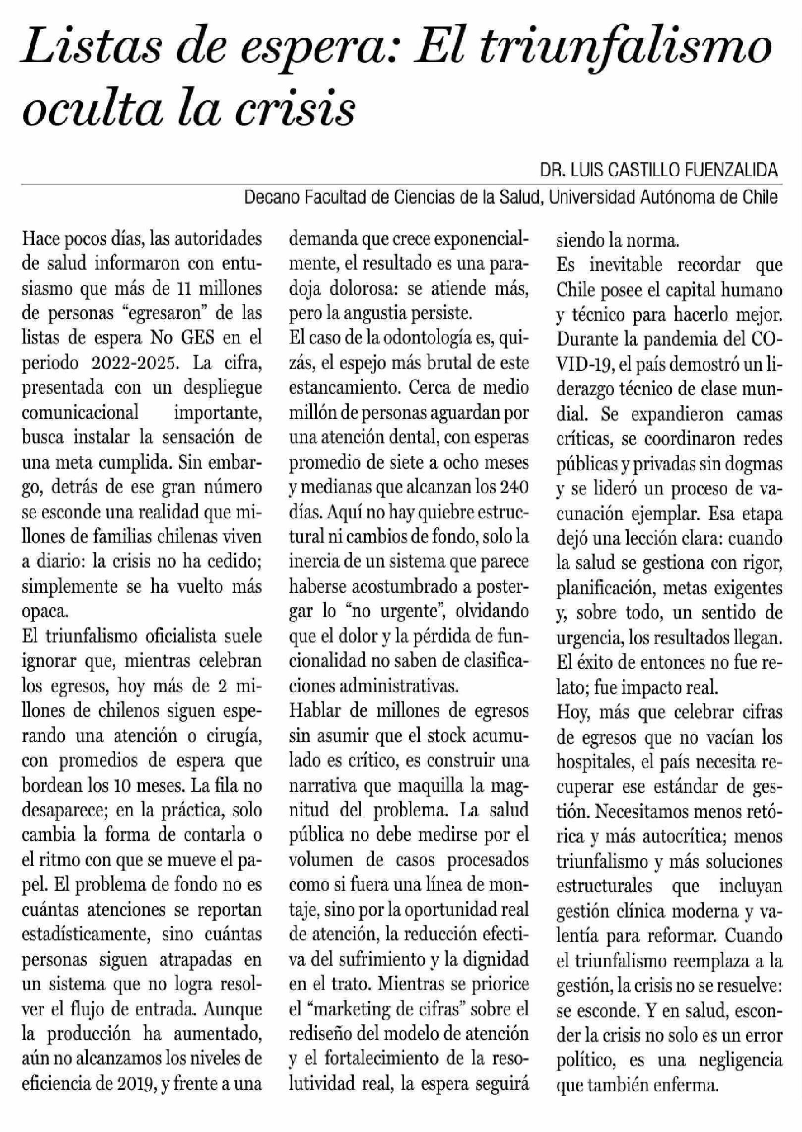 Cartas: Listas de espera: El triunfalismo oculta la crisis 09-02-2026 La Prensa de Curicó |