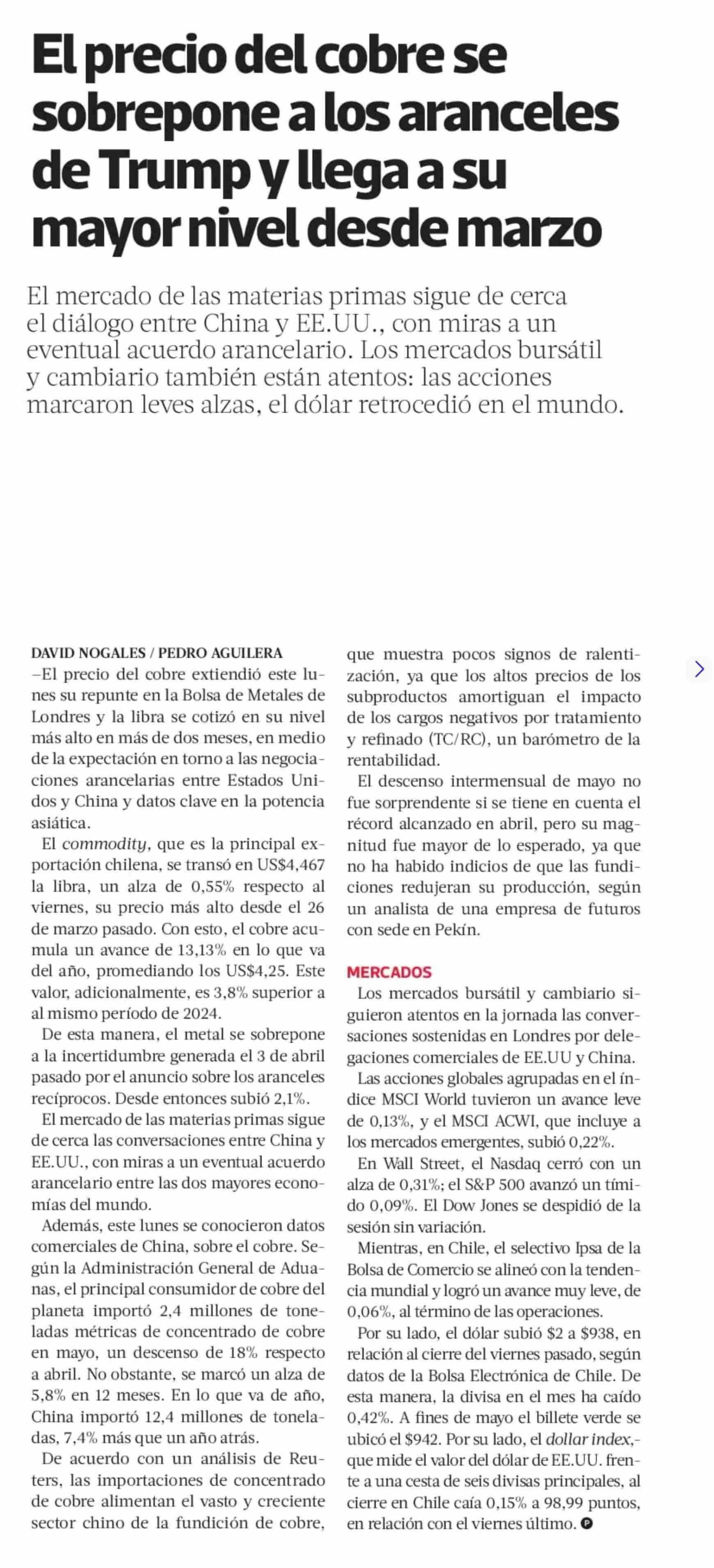 El precio del cobre se sobrepone a los aranceles de Trump y llega a su mayor nivel desde marzo 10-06-2025 La Tercera |