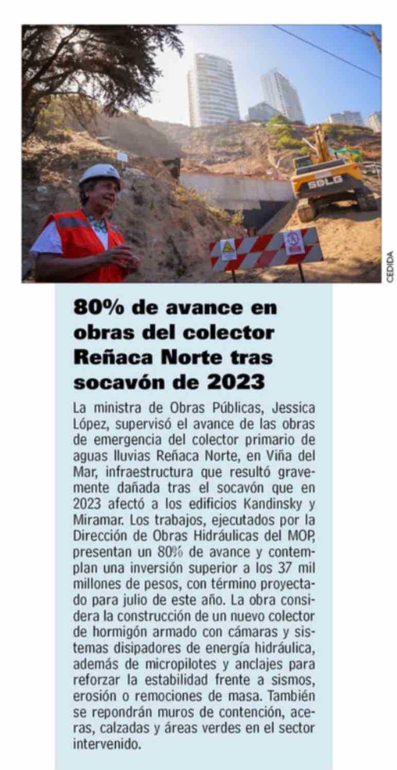 Título: 80% De avance en obras del colector Reñaca Norte tras socavón de 2023