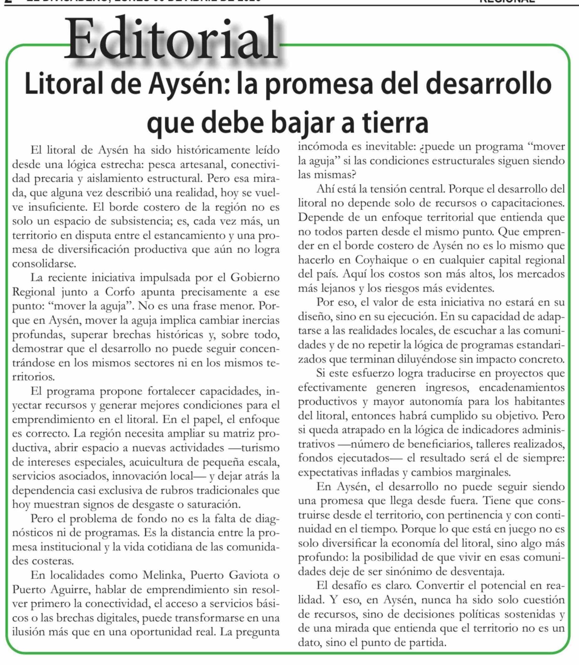 Columnas de Opinión: Litoral de Aysén: la promesa del desarrollo que debe bajar a tierra 06-04-2026 El Divisadero |