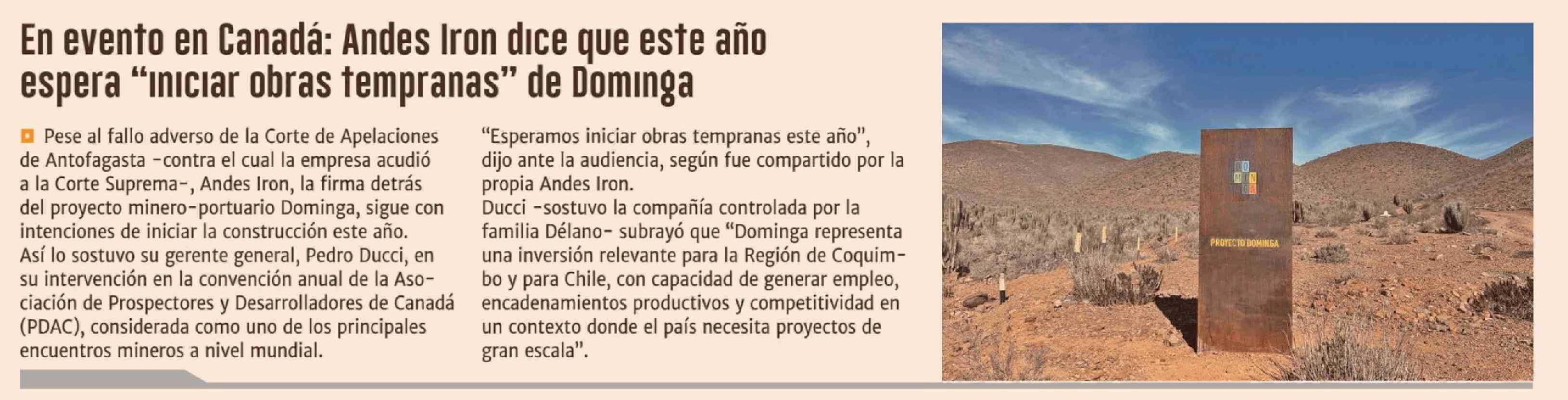Título: En evento en Canadá: Andes Iron dice que este año espera "Iniciar obras tempranas" de Dominga
