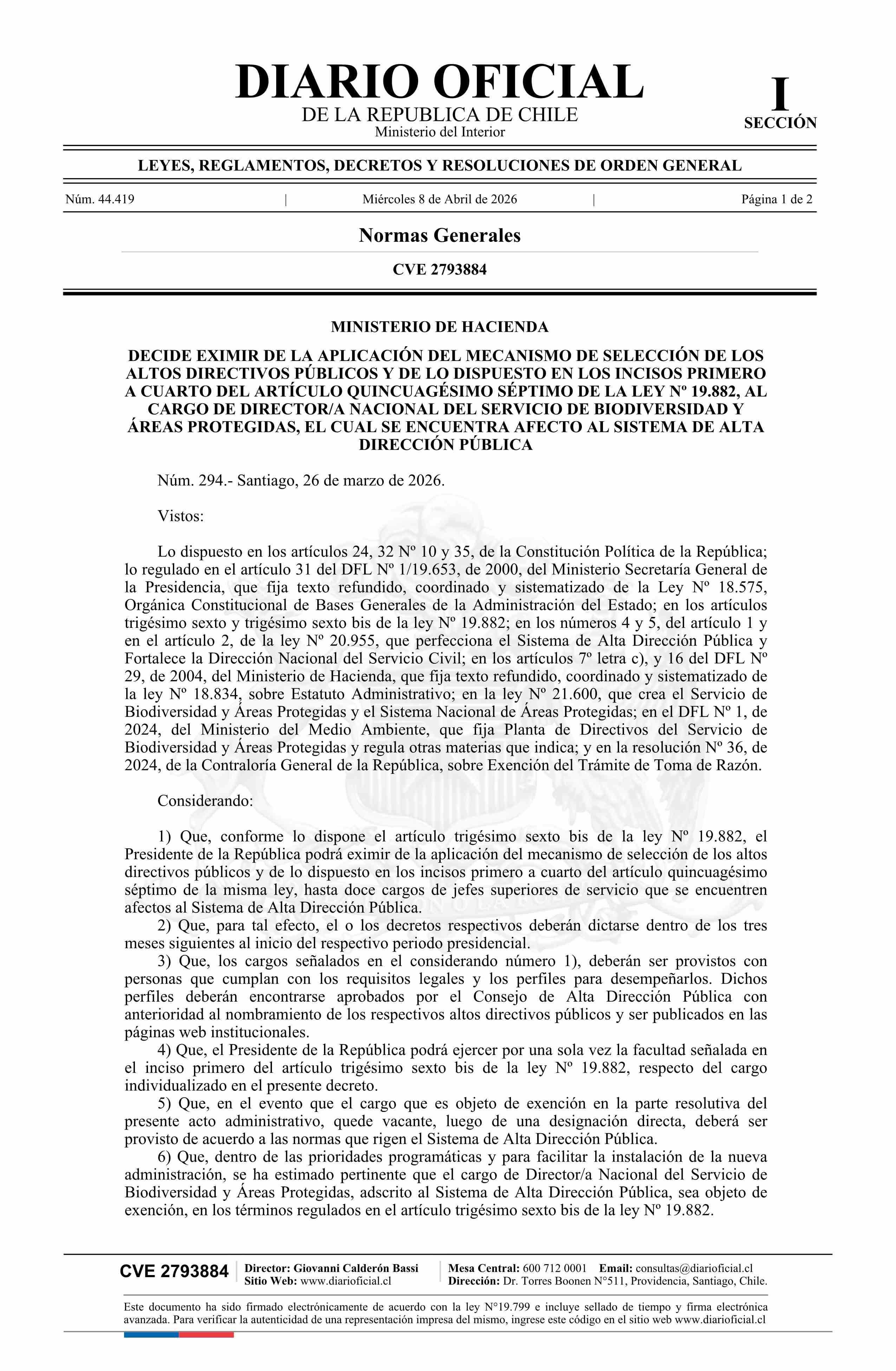 | Título: | Decreto número 294, de 2026.- Decide eximir de la aplicación del mecanismo de selección de los altos directivos públicos y de lo dispuesto en los incisos primero a cuarto del artículo quincuagésimo séptimo de la ley Nº 19.882, al cargo de Director/a Nacional del Servicio de Biodiversidad y Áreas Pro |