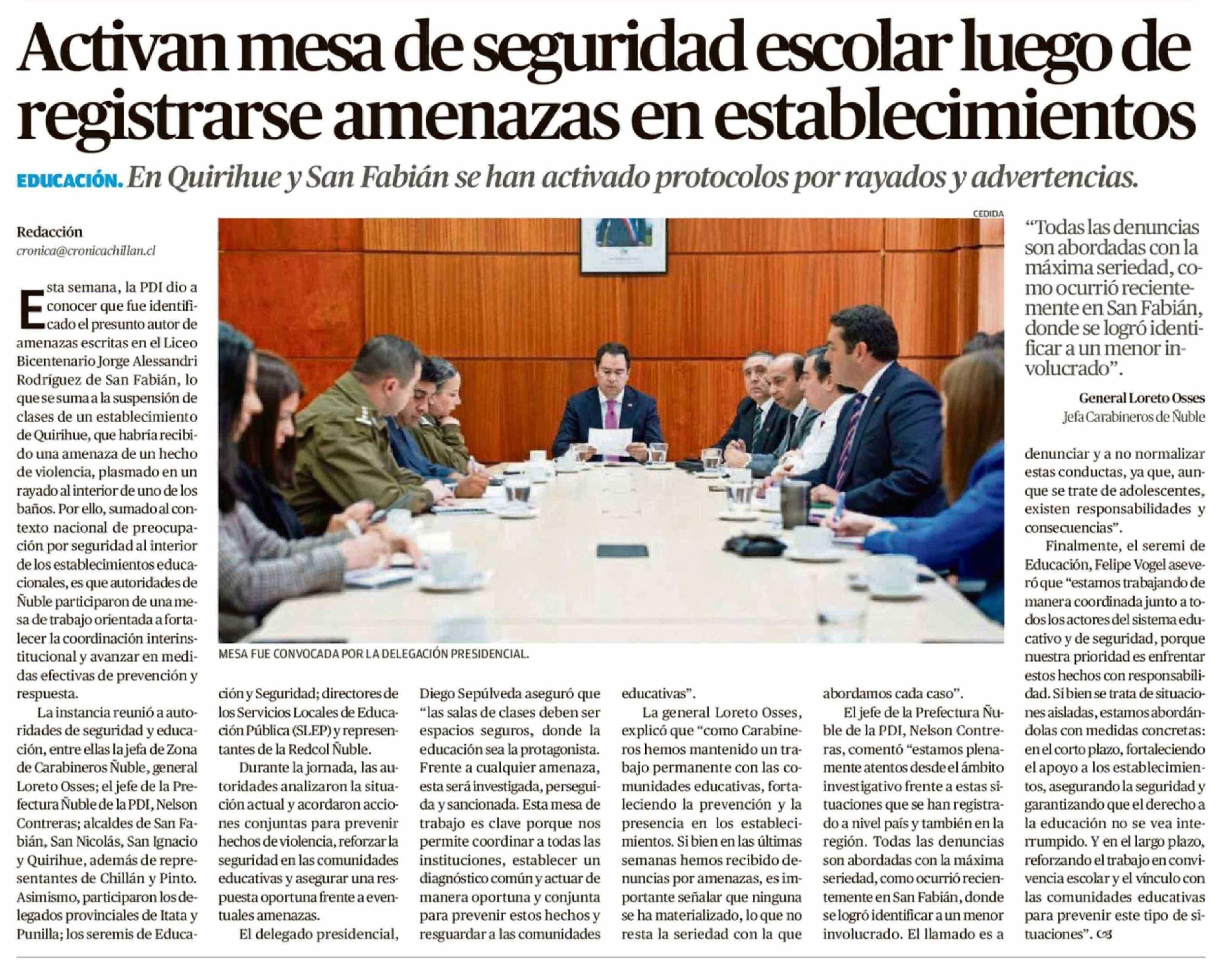 Activan mesa de seguridad escolar luego de registrarse amenazas en establecimientos 15-04-2026 Crónica de Chillán |