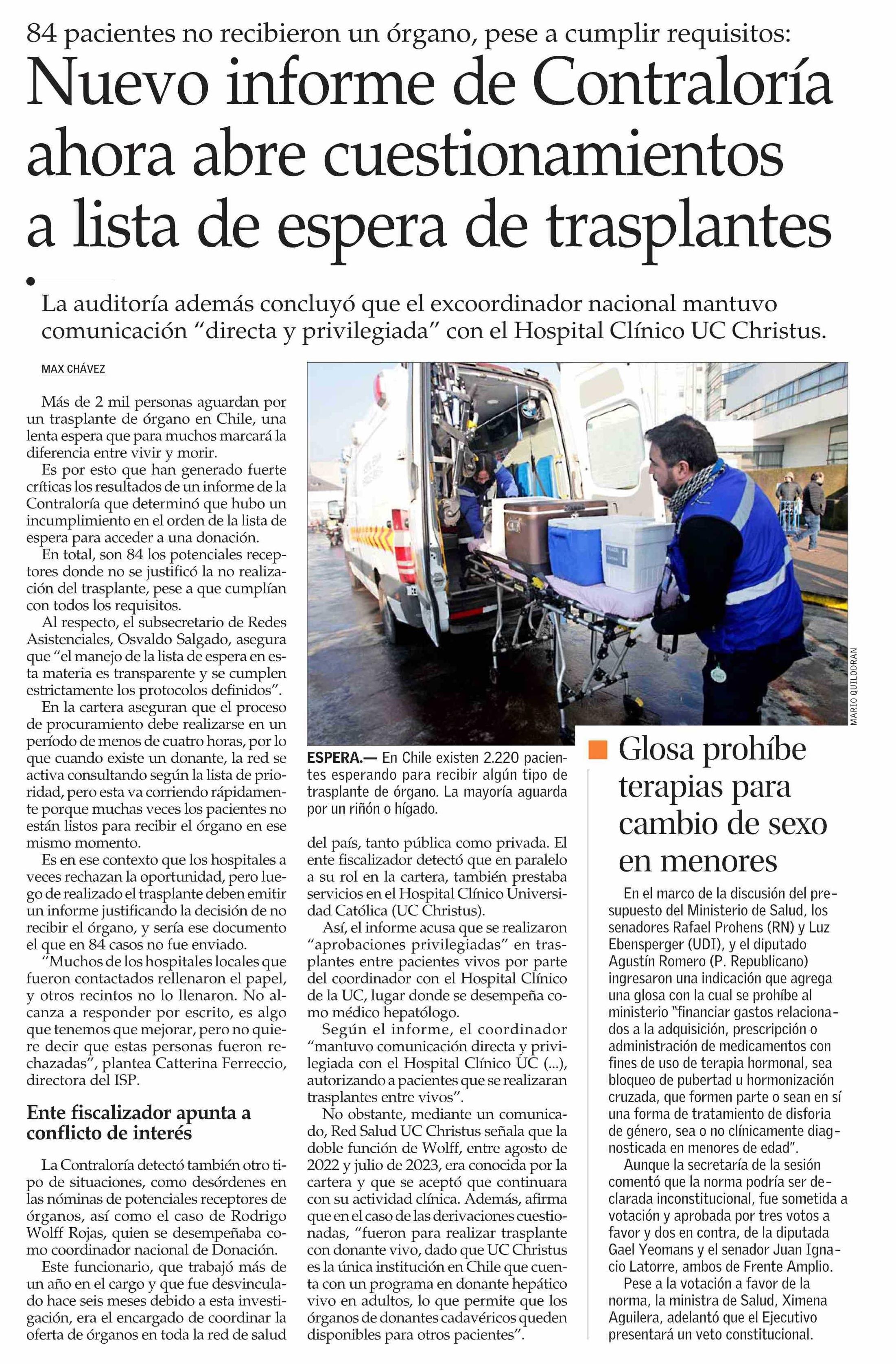 Nuevo informe de Contraloría ahora abre cuestionamientos a lista de espera de trasplantes 31-10-2024 El Mercurio |