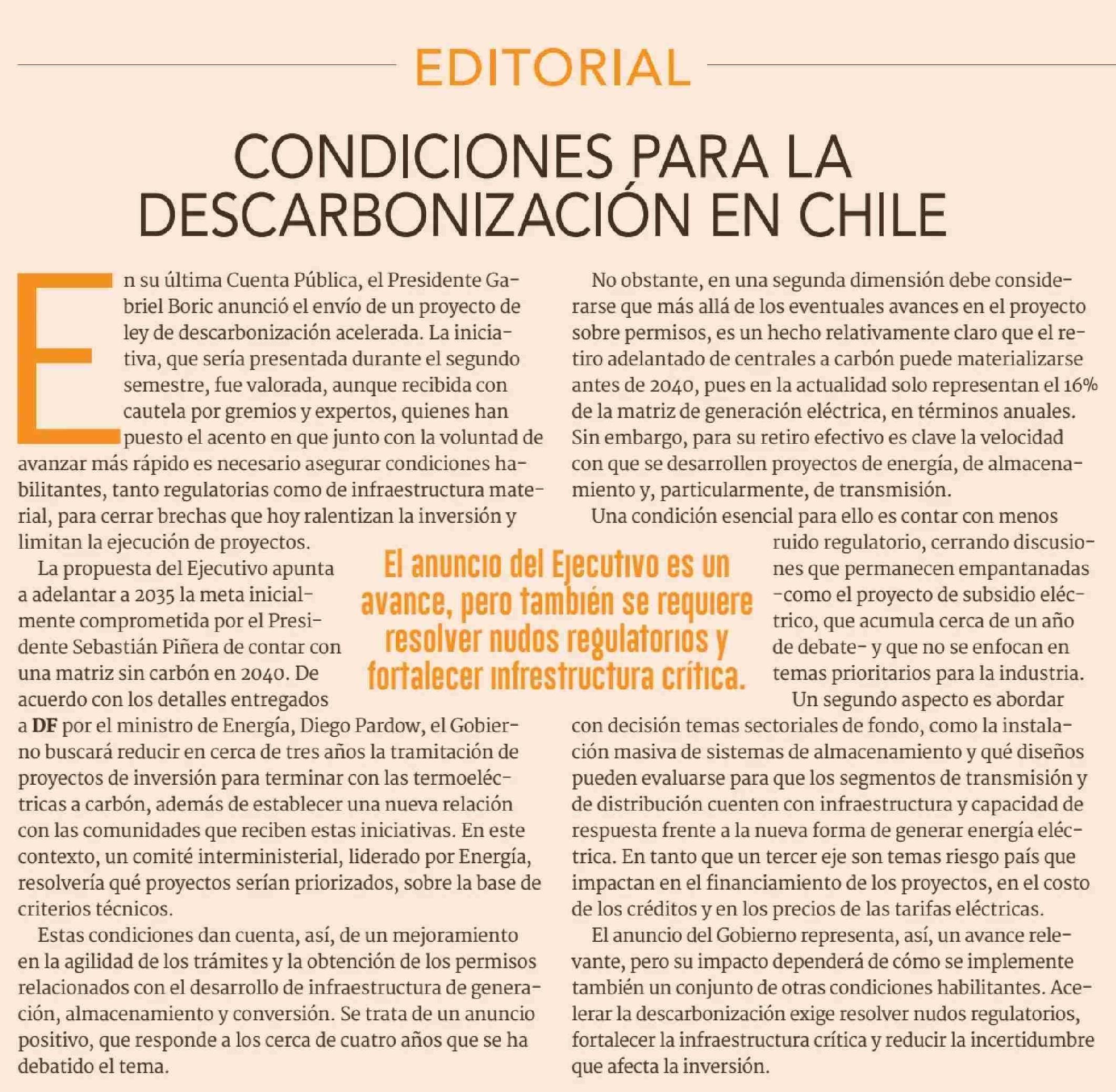 EDITORIAL: CONDICIONES PARA LA DESCARBONIZACION EN CHILE 03-06-2025 Diario Financiero |