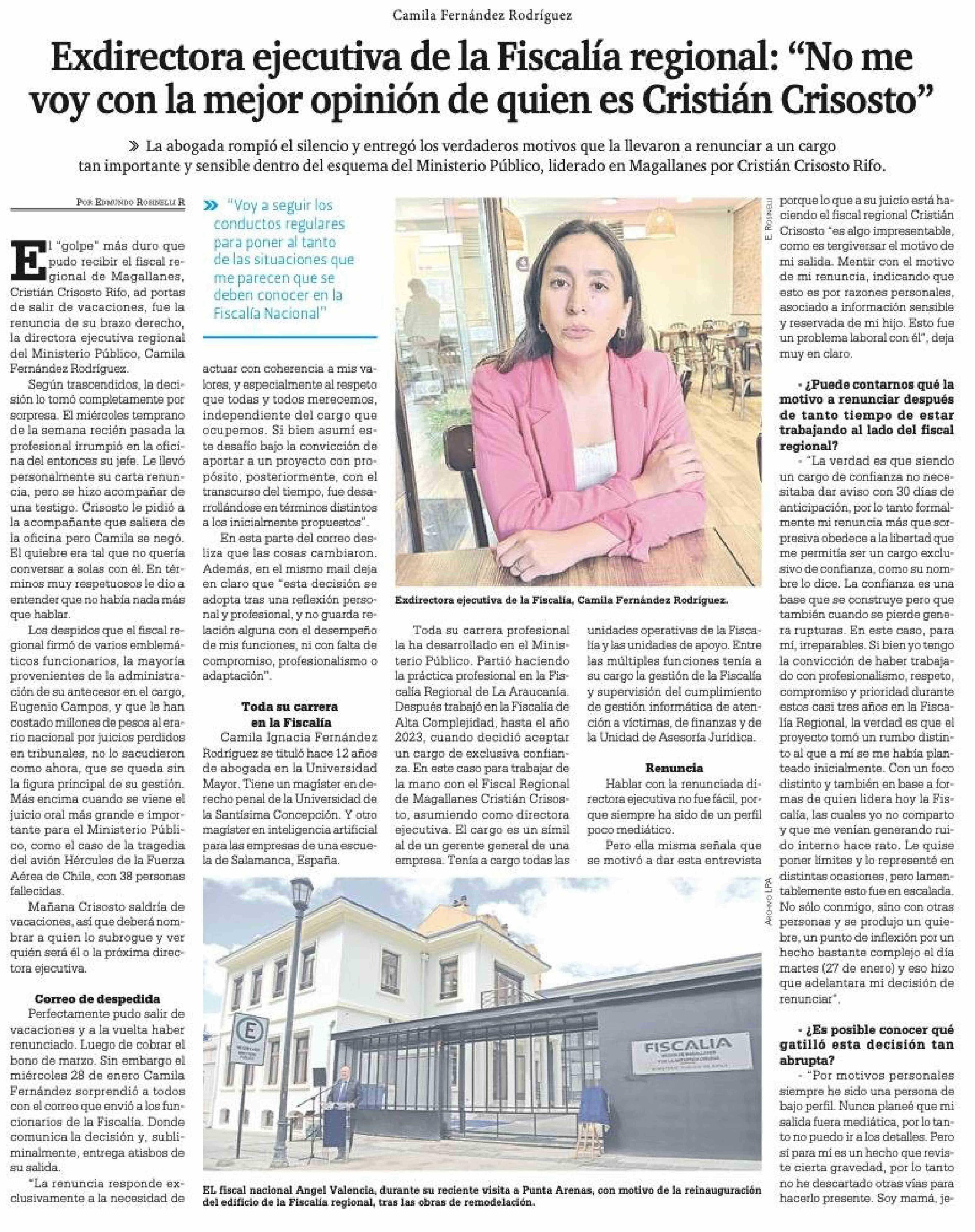 Exdirectora ejecutiva de la Fiscalía regional: "No me voy con la mejor opinión de quien es Cristián Crisosto" 02-02-2026 La Prensa Austral |