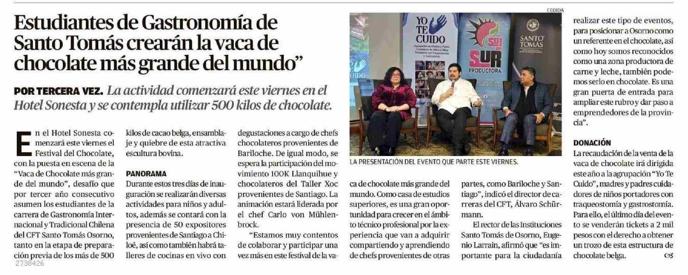 Estudiantes de Gastronomía de Santo Tomás crearán la vaca de chocolate más grande del mundo" 18-06-2025 El Austral de Osorno |