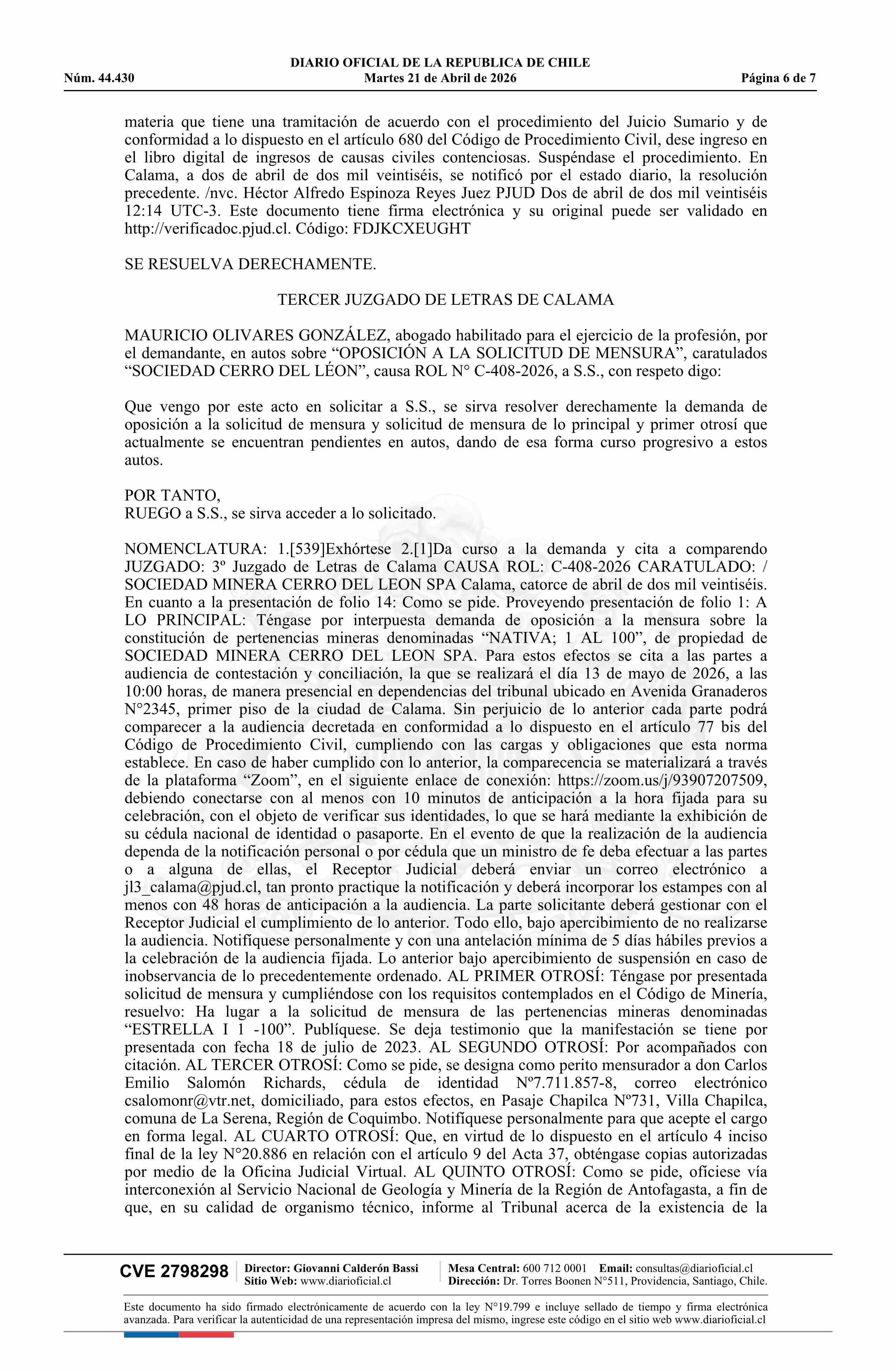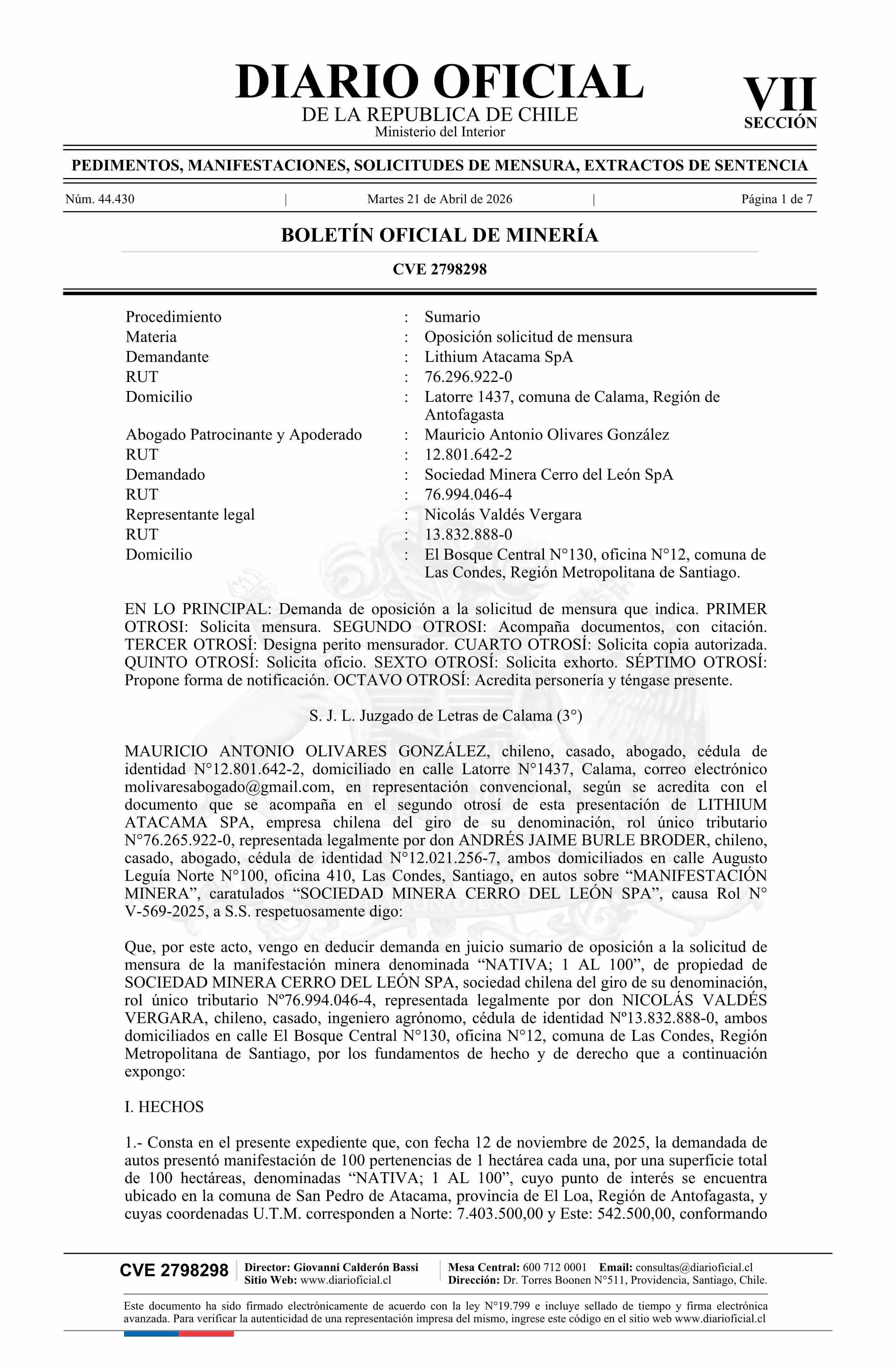 Fuente: DIARIO OFICIAL CHILE - BOLETÍN OFICIAL DE MINERÍA (DIARIO OFICIAL CHILE – BOM- OPOSICIÓN DE MENSURA) Página(s): 1-7