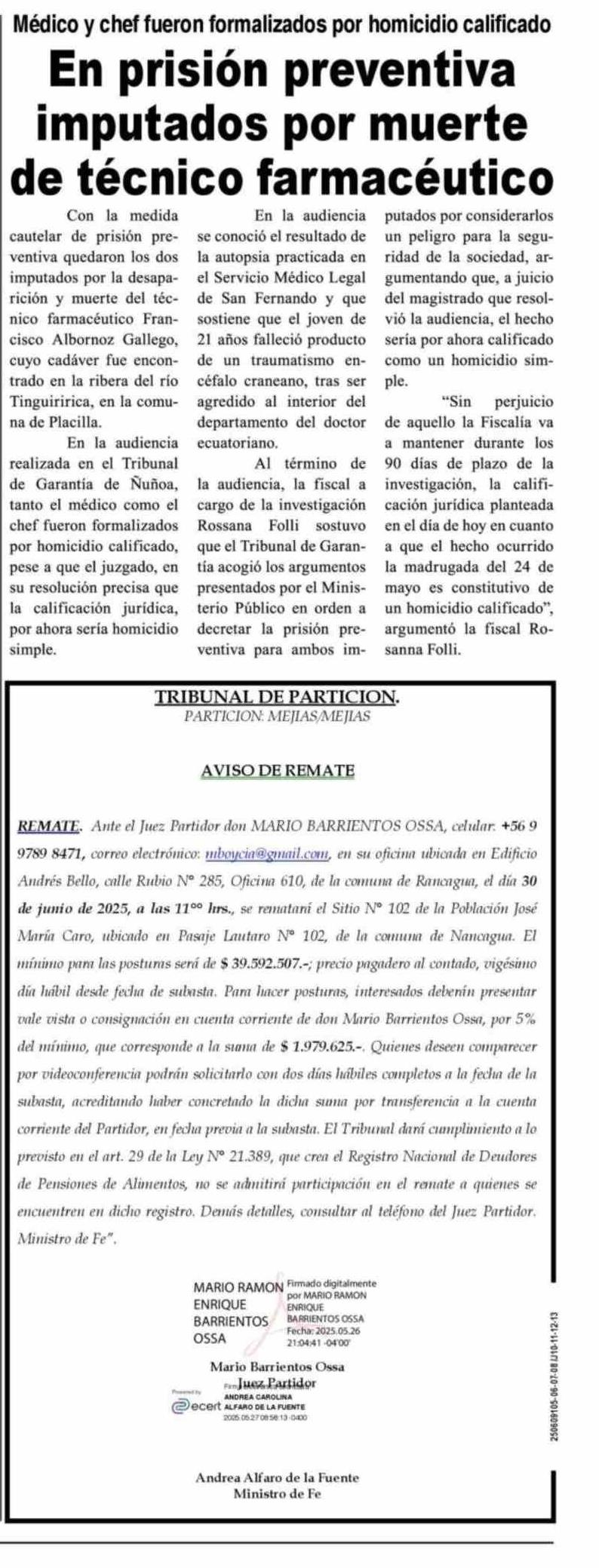 En prisión preventiva imputados por muerte de técnico farmacéutico 10-06-2025 Diario VI Región |