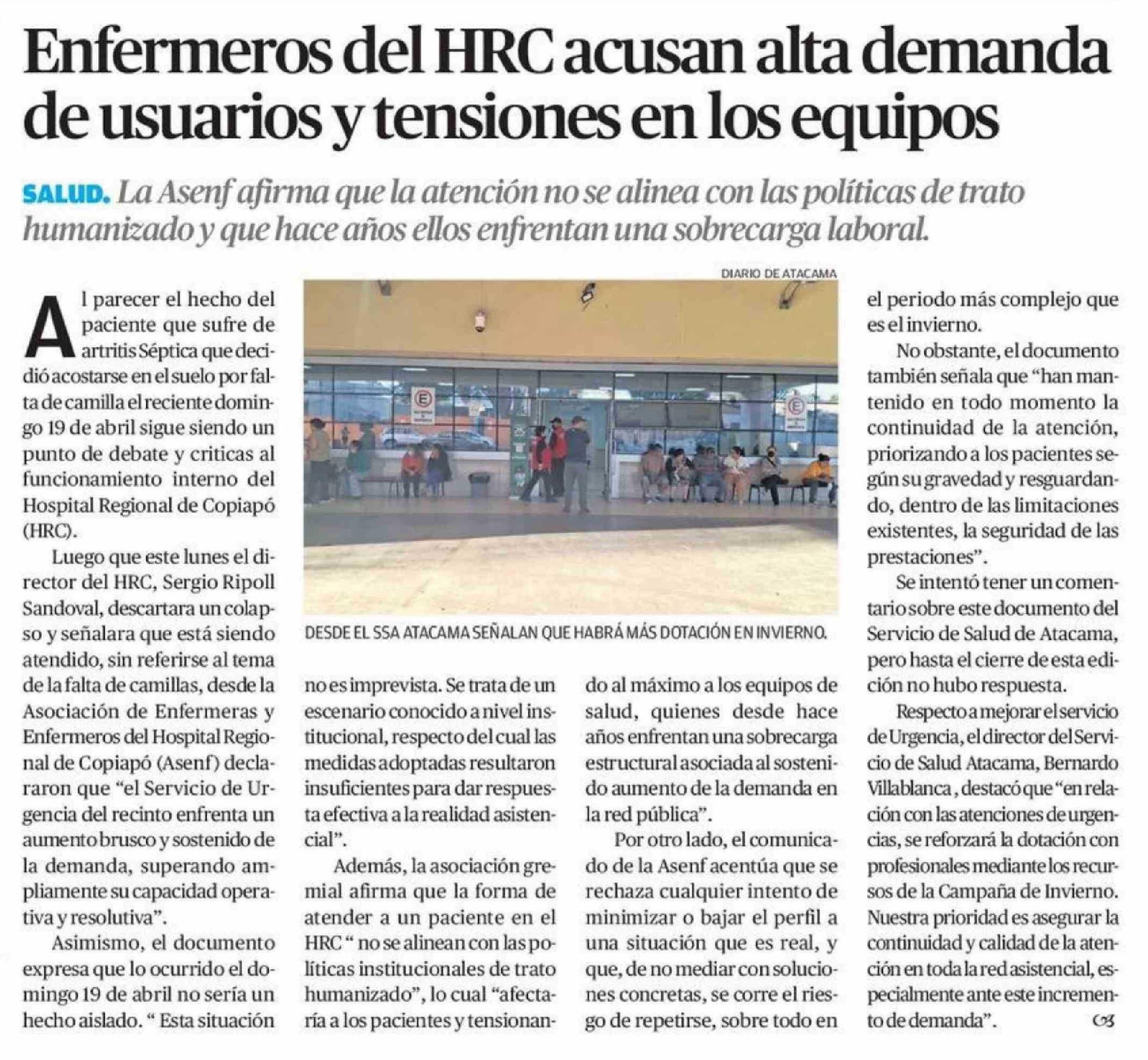 Título: Enfermeros del HRC acusan alta demanda de usuarios y tensiones en los equipos