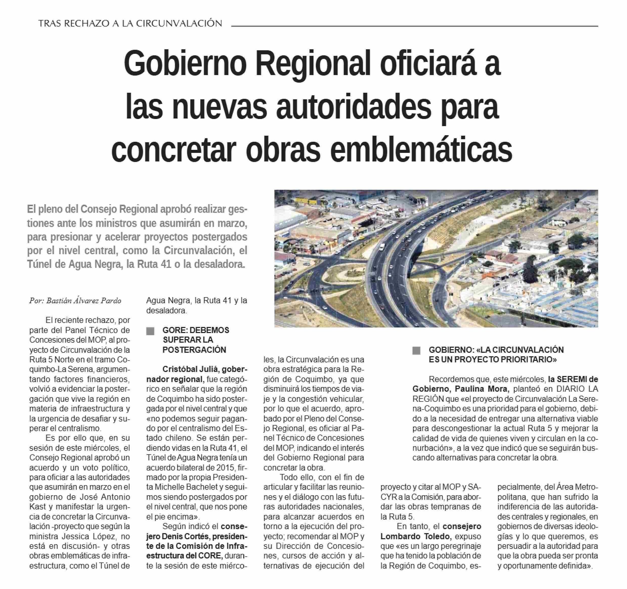 Gobierno Regional oficiará a las nuevas autoridades para concretar obras emblemáticas 26-02-2026 Diario la Región |