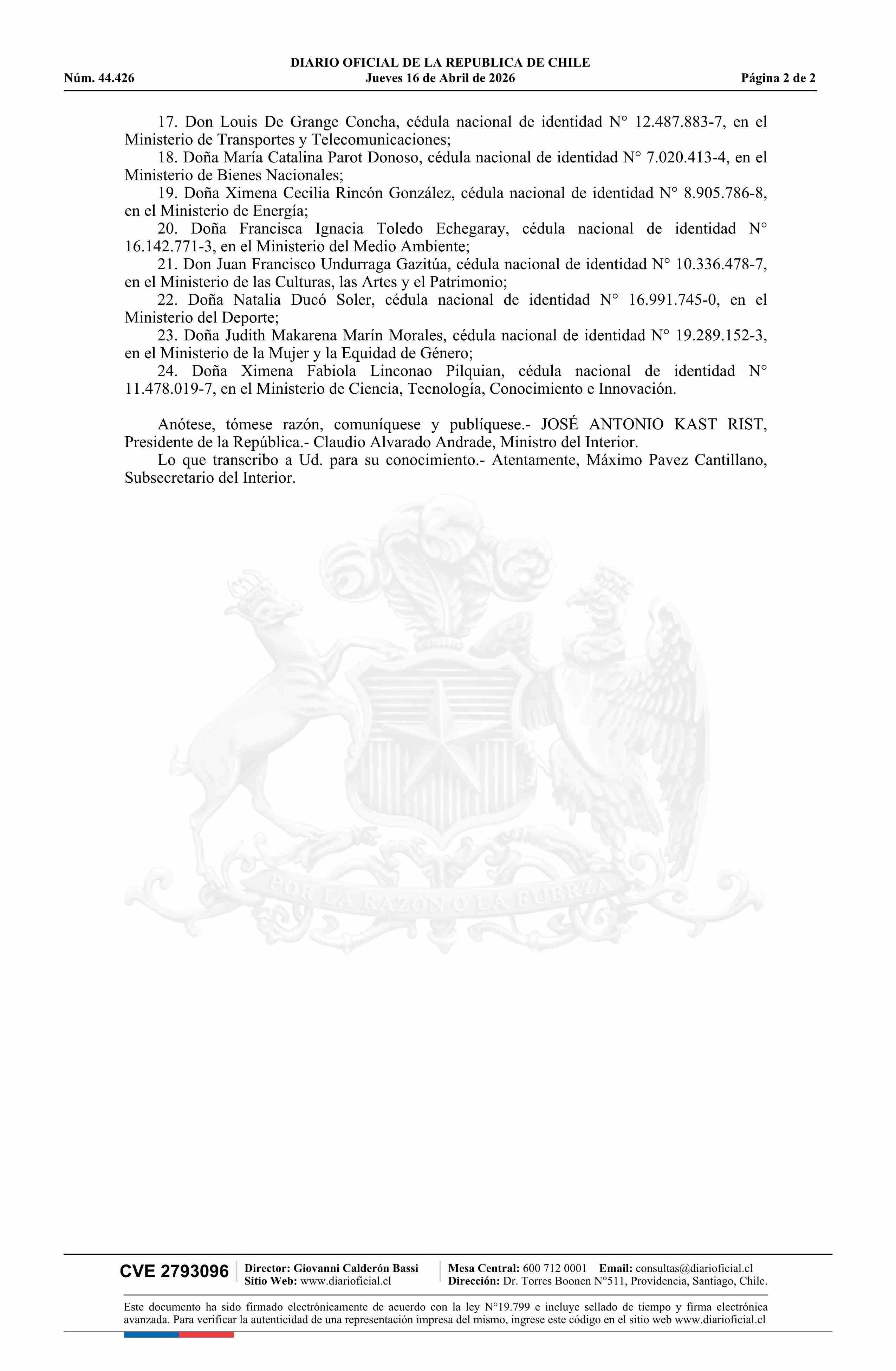 Decreto número 38, de 2026.- Nombra ministros de Estado en las carteras que indica