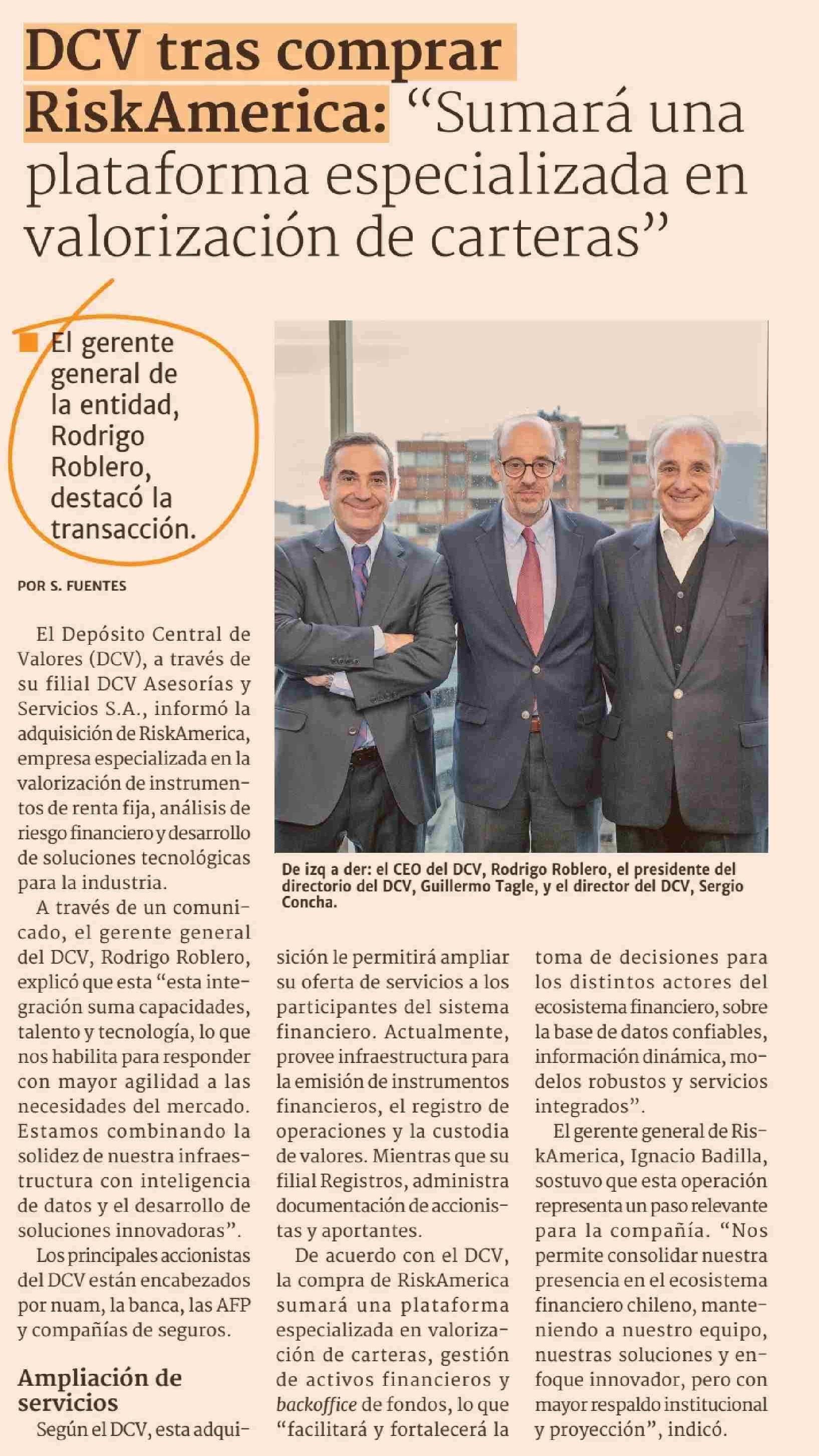 Título: DCV tras comprar RiskAmerica: “Sumará una plataforma especializada en valorización de carteras”