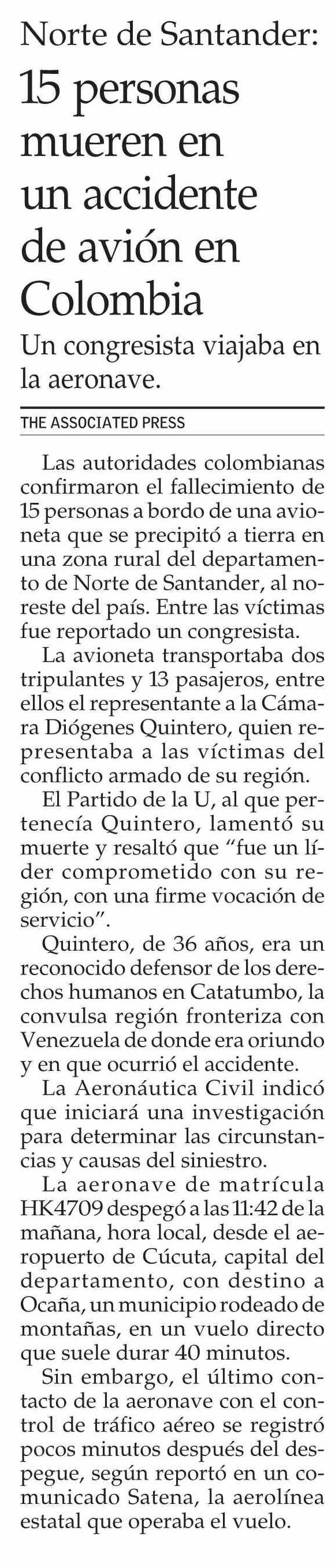 | Título: | Norte de Santander: 15 personas mueren en un accidente de avión en Colombia |