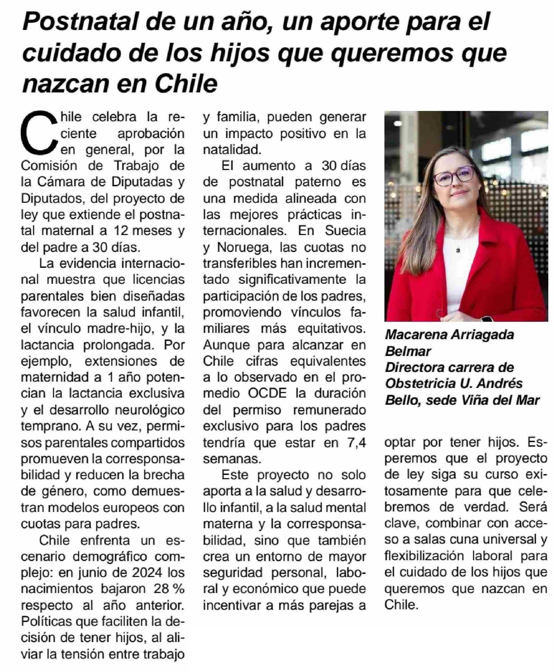 COLUMNAS DE OPINIÓN: Postnatal de un año, un aporte para el cuidado de los hijos que queremos que nazcan en Chile 14-06-2025 Diario El Cóndor |