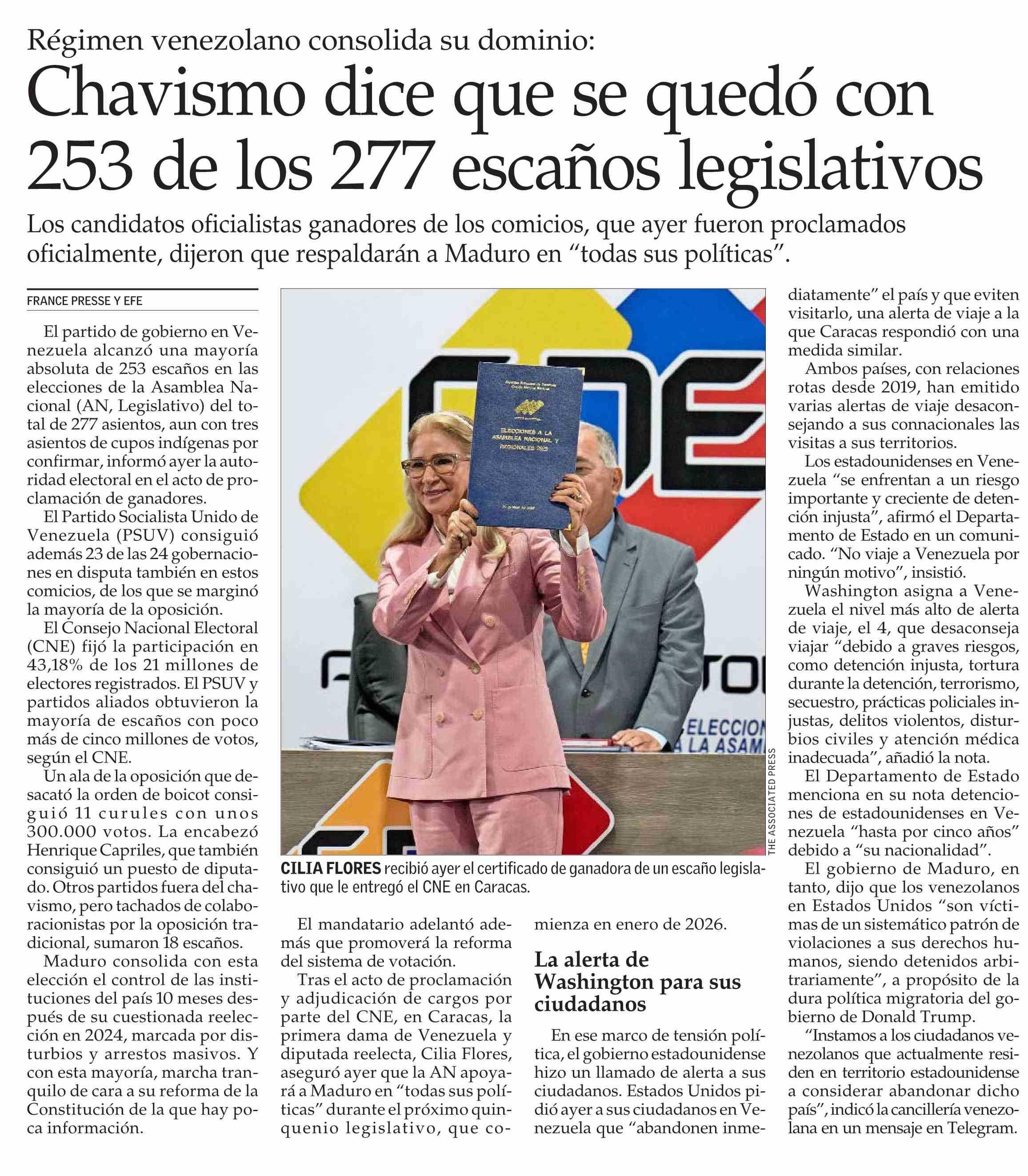 Chavismo dice que se quedó con 253 de los 277 escaños legislativos 28-05-2025 El Mercurio |