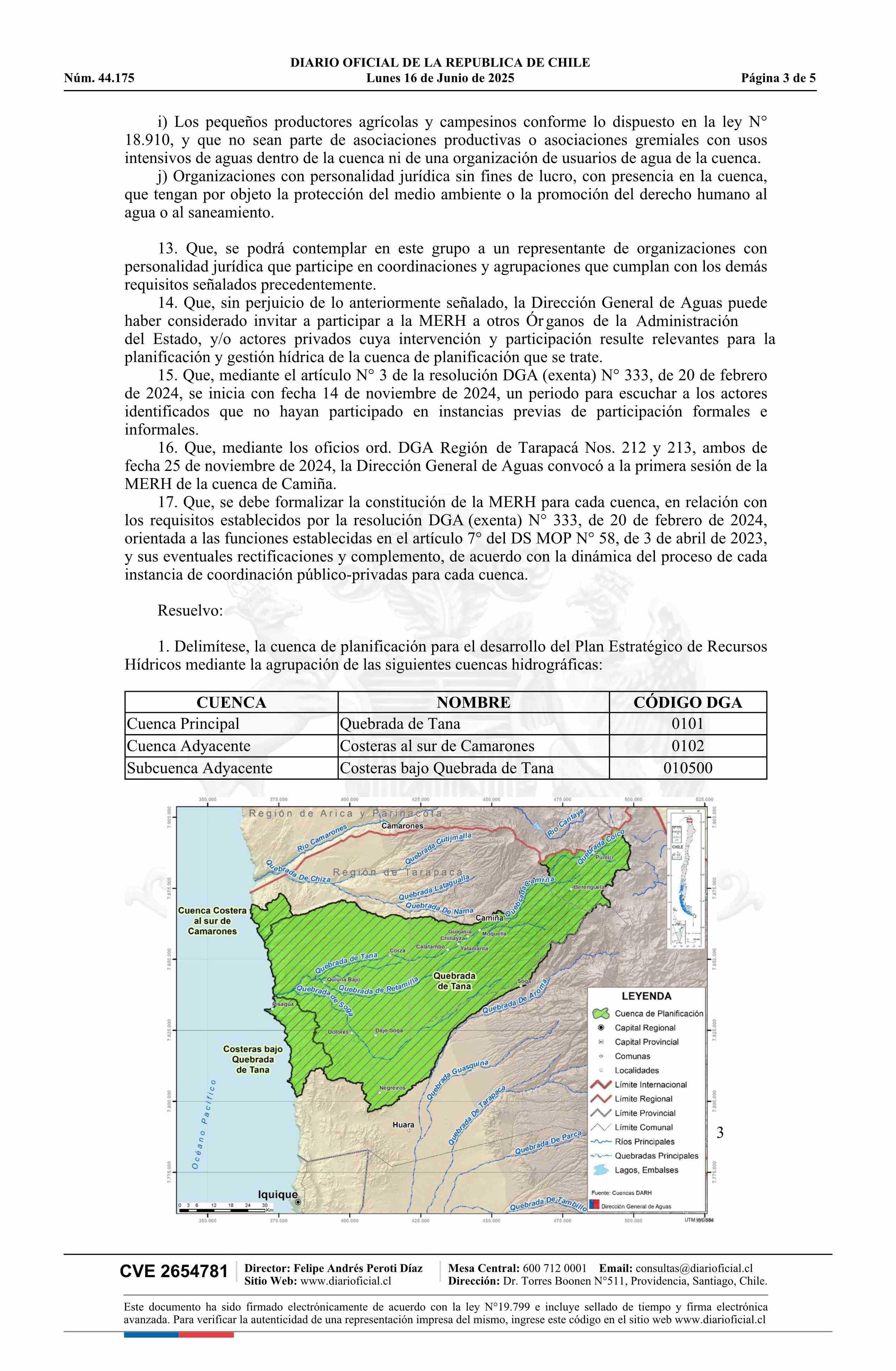 | Título: | Resolución exenta número 1.849, de 2025.- Delimita y denomina cuenca de planificación para el desarrollo del Plan Estratégico de Recursos Hídricos en la Cuenca de Camiña; constituye mesa estratégica de recursos hídricos e identifica convocados y asistencia a primera sesión; y designa Delegado(a) de |