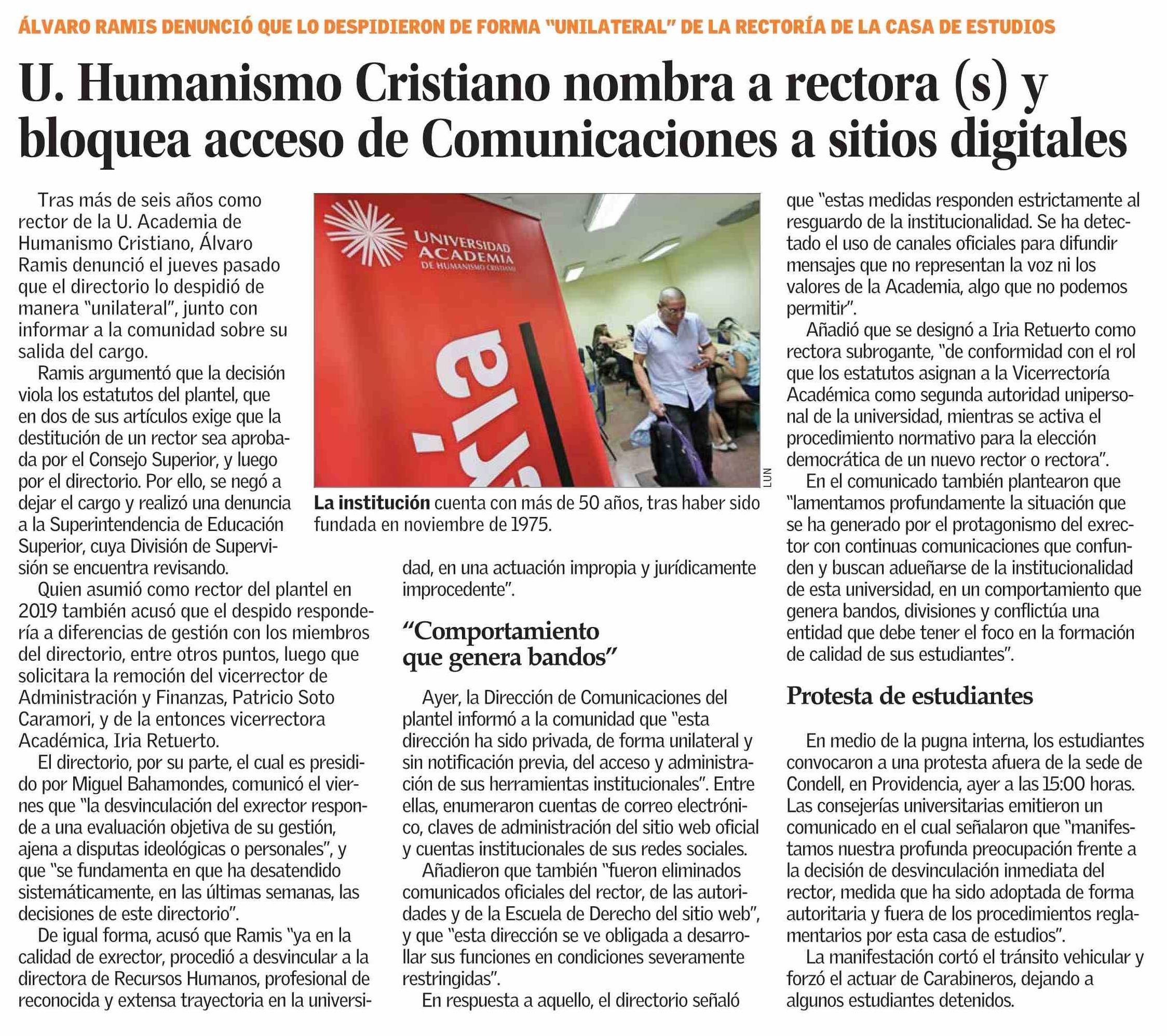 Título: U. Humanismo Cristiano nombra a rectora (s) y bloquea acceso de Comunicaciones a sitios digitales