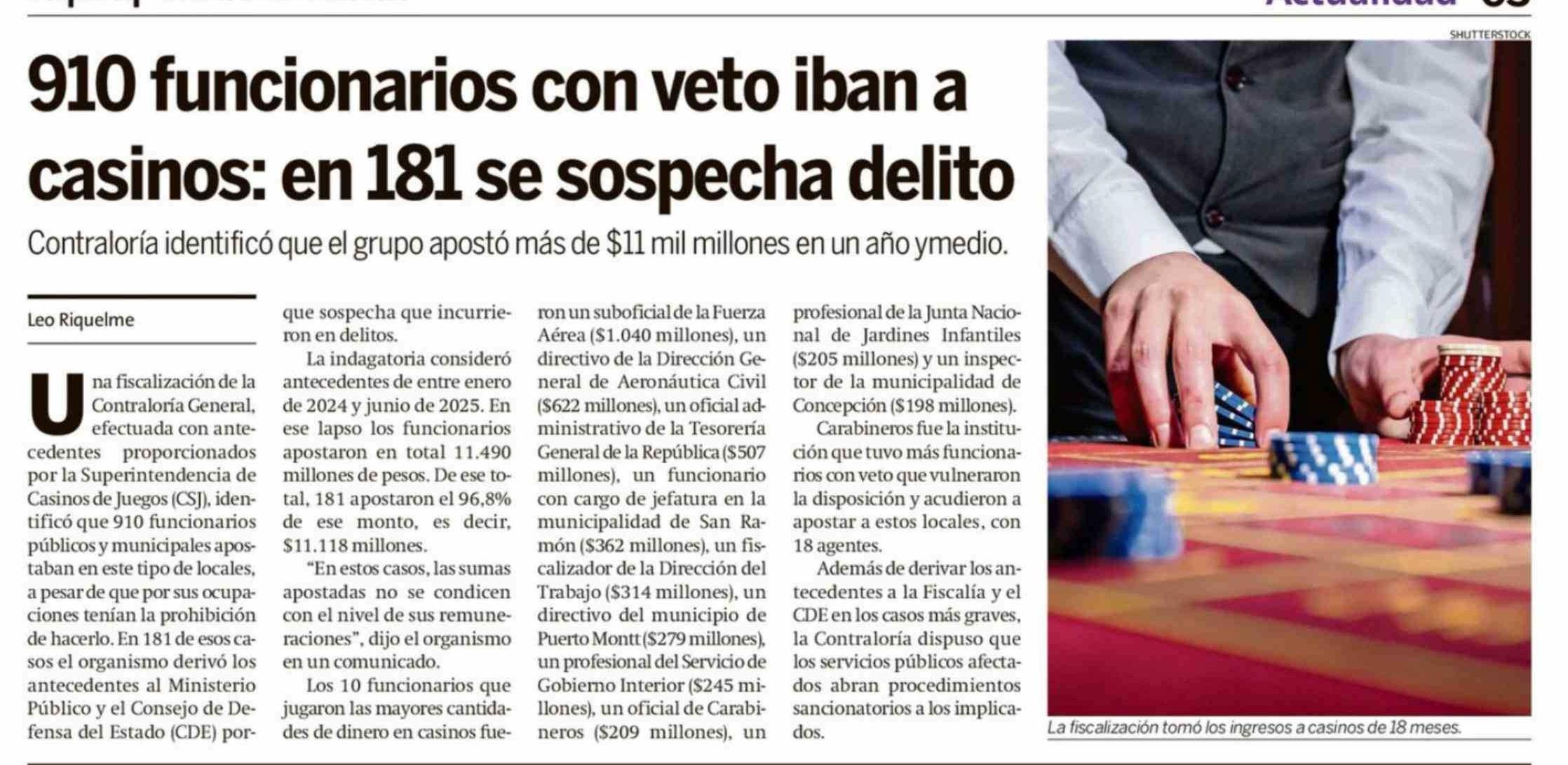 Título: 910 Funcionarios con veto iban a casinos: en 181 se sospecha delito