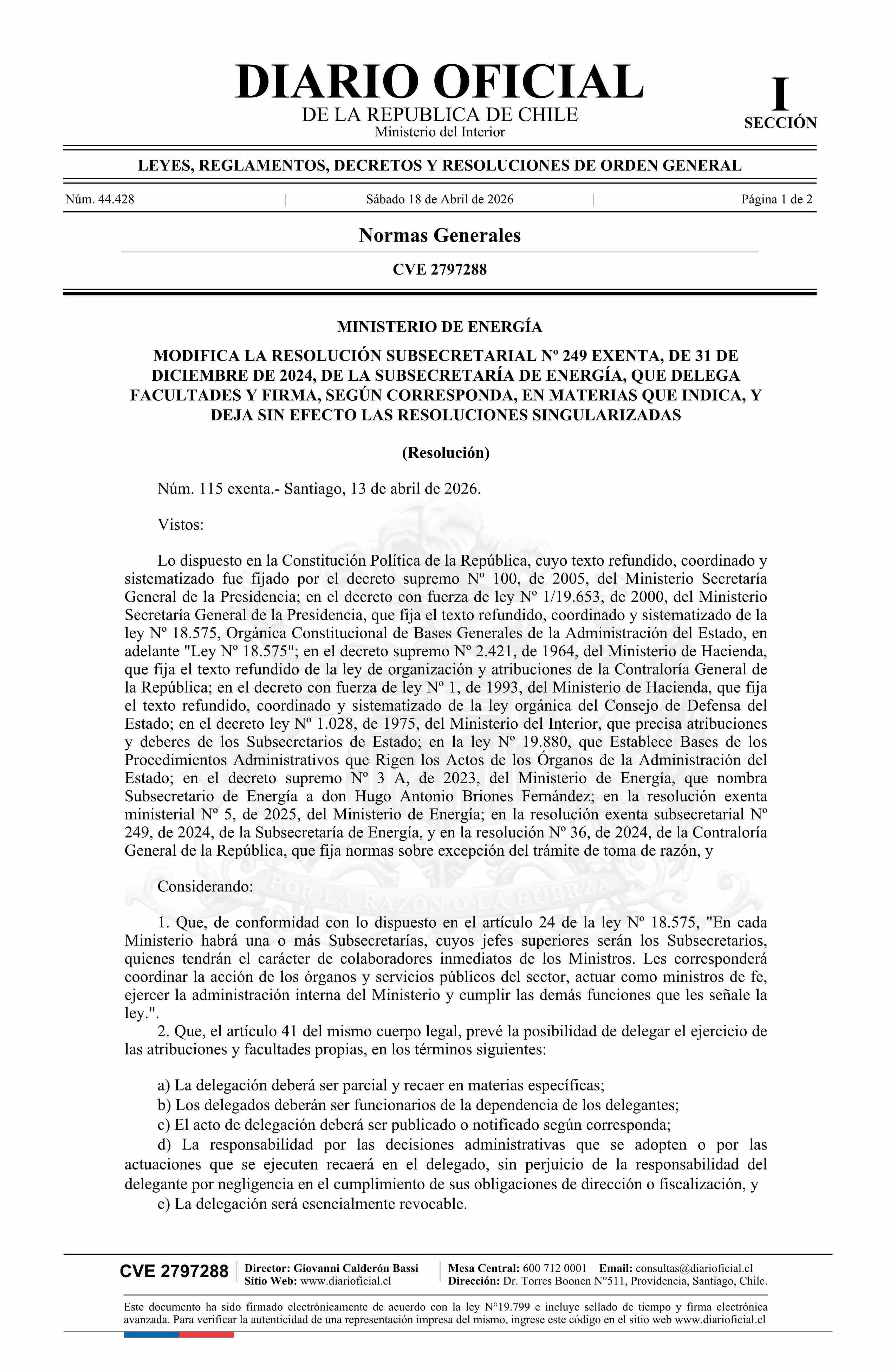 | Título: | Resolución exenta número 115, de 2026.- Modifica la resolución Nº 249 exenta, de 2024, que delega facultades y firma, según corresponda, en materias que indica y deja sin efecto las resoluciones singularizadas |