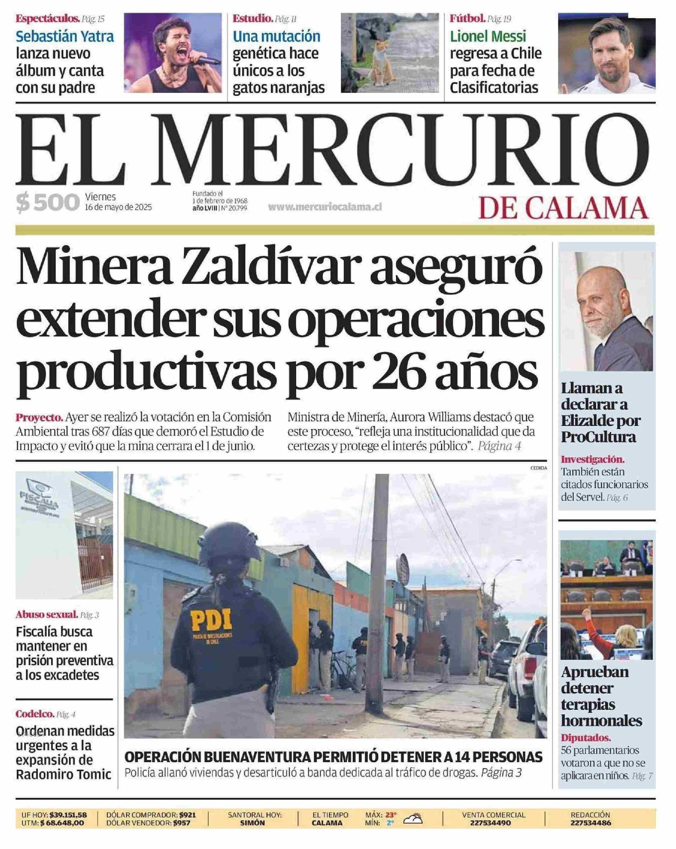 PORTADA EL MERCURIO DE CALAMA - CHILE 16-05-2025 El Mercurio de Calama |