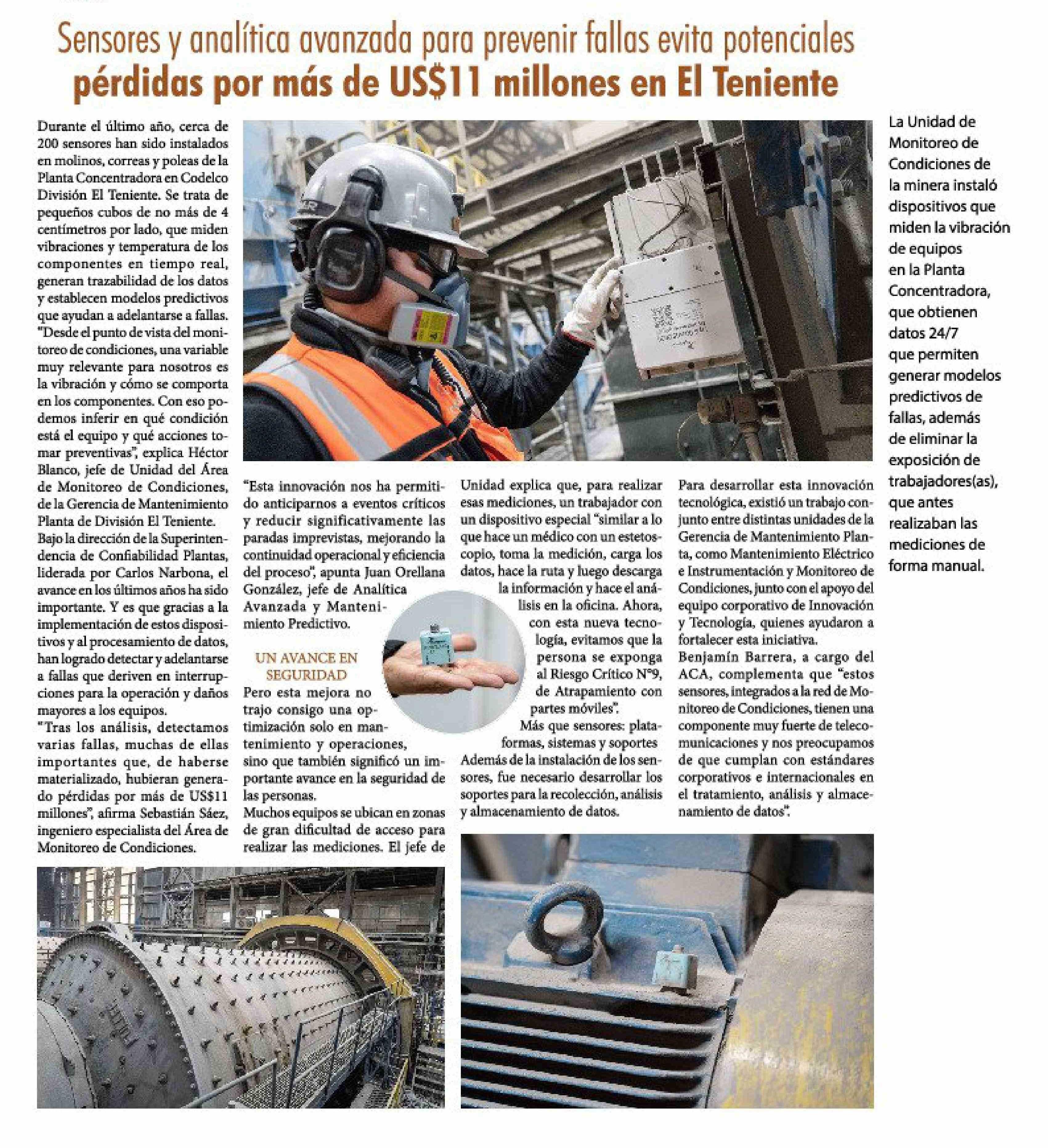 | Título: | Sensores y analítica avanzada para prevenir fallas evita potenciales pérdidas por más de US$11 millones en El Teniente |