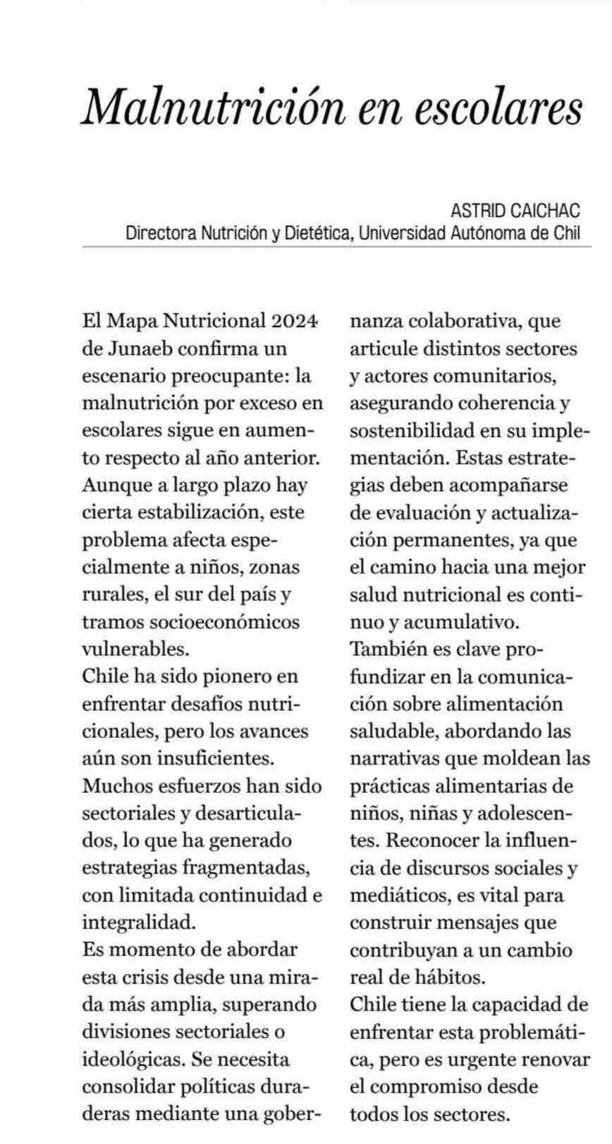COLUMNAS DE OPINIÓN: Malnutrición en escolares 07-06-2025 La Prensa de Curicó |