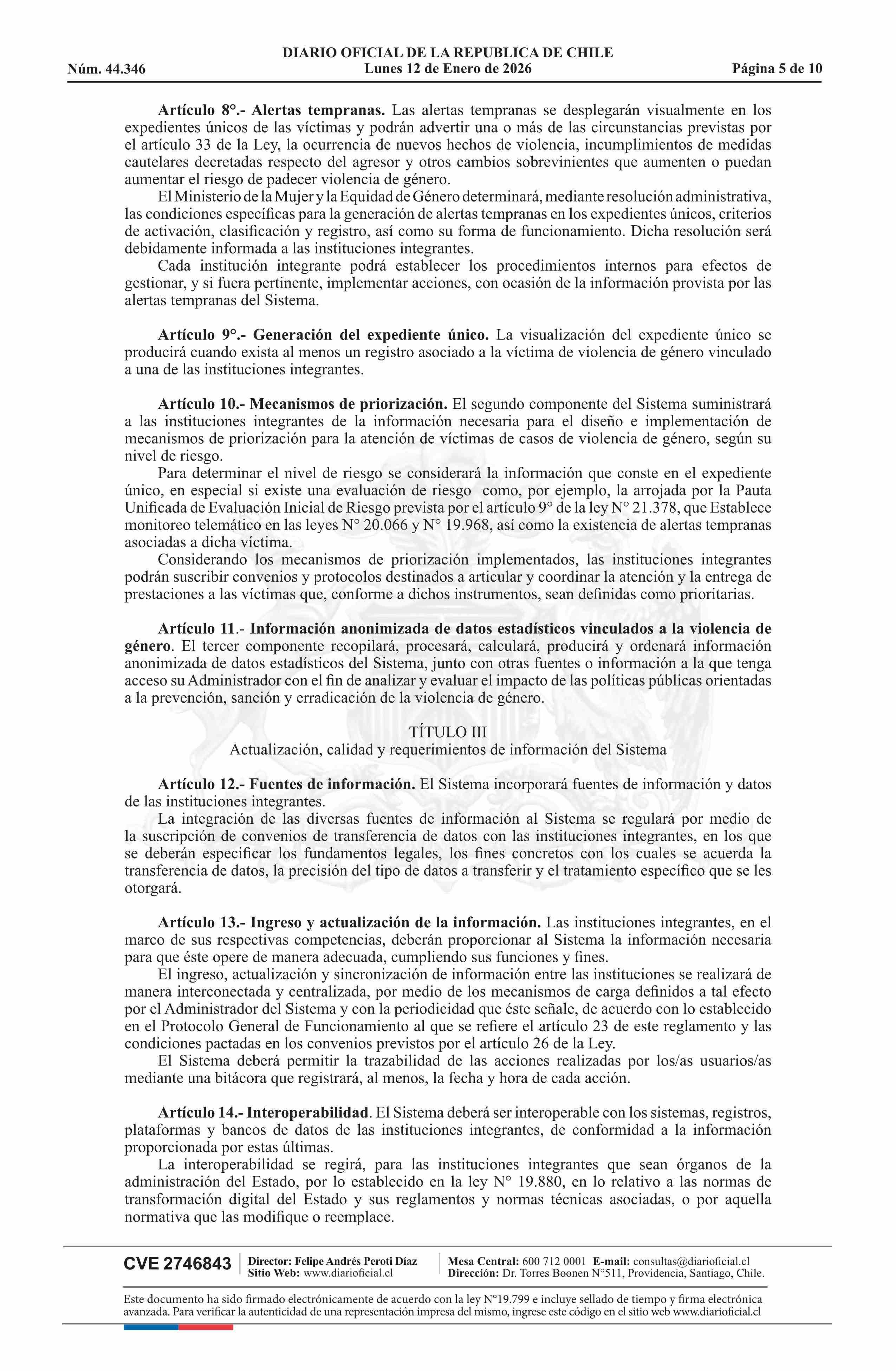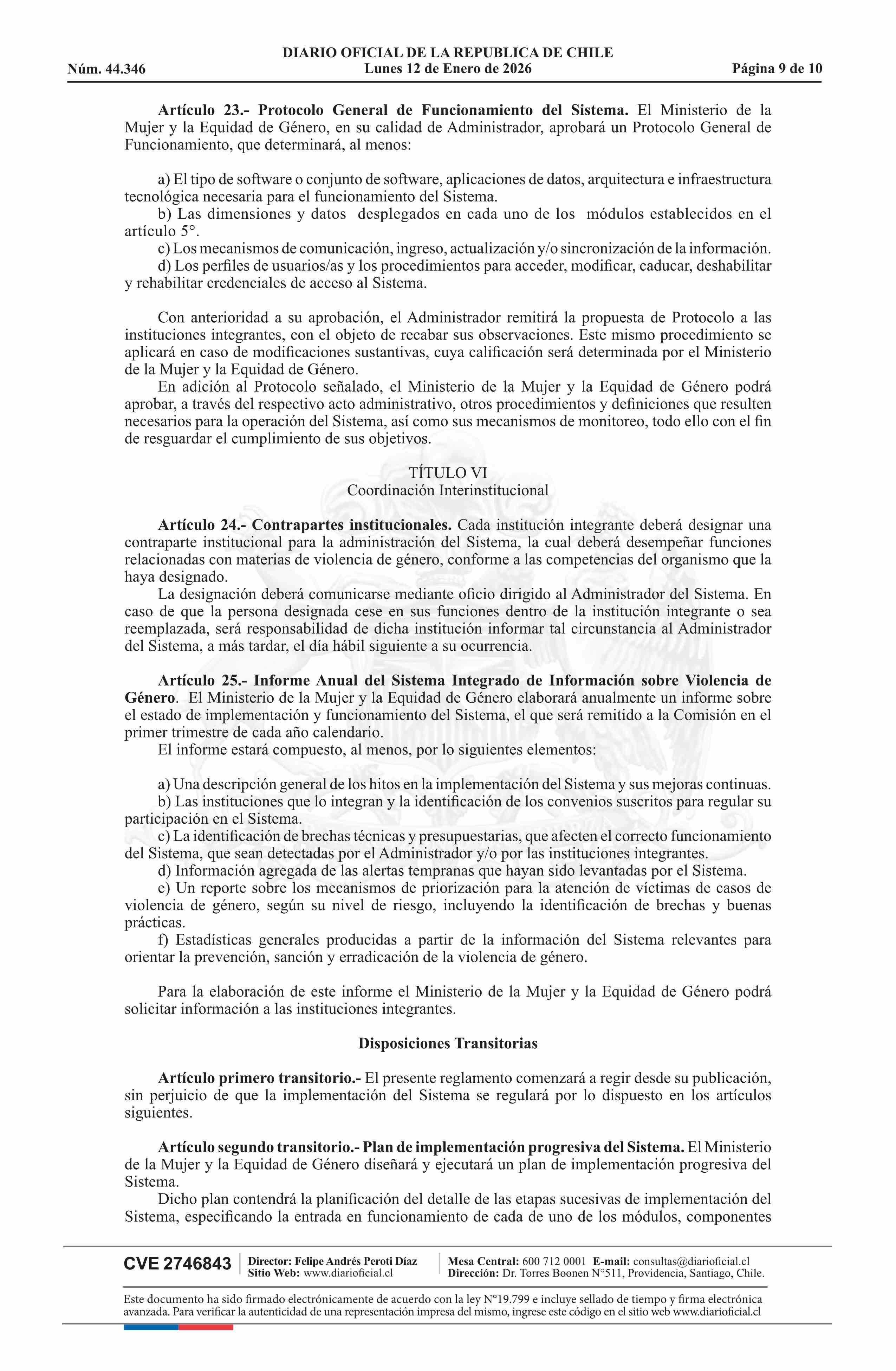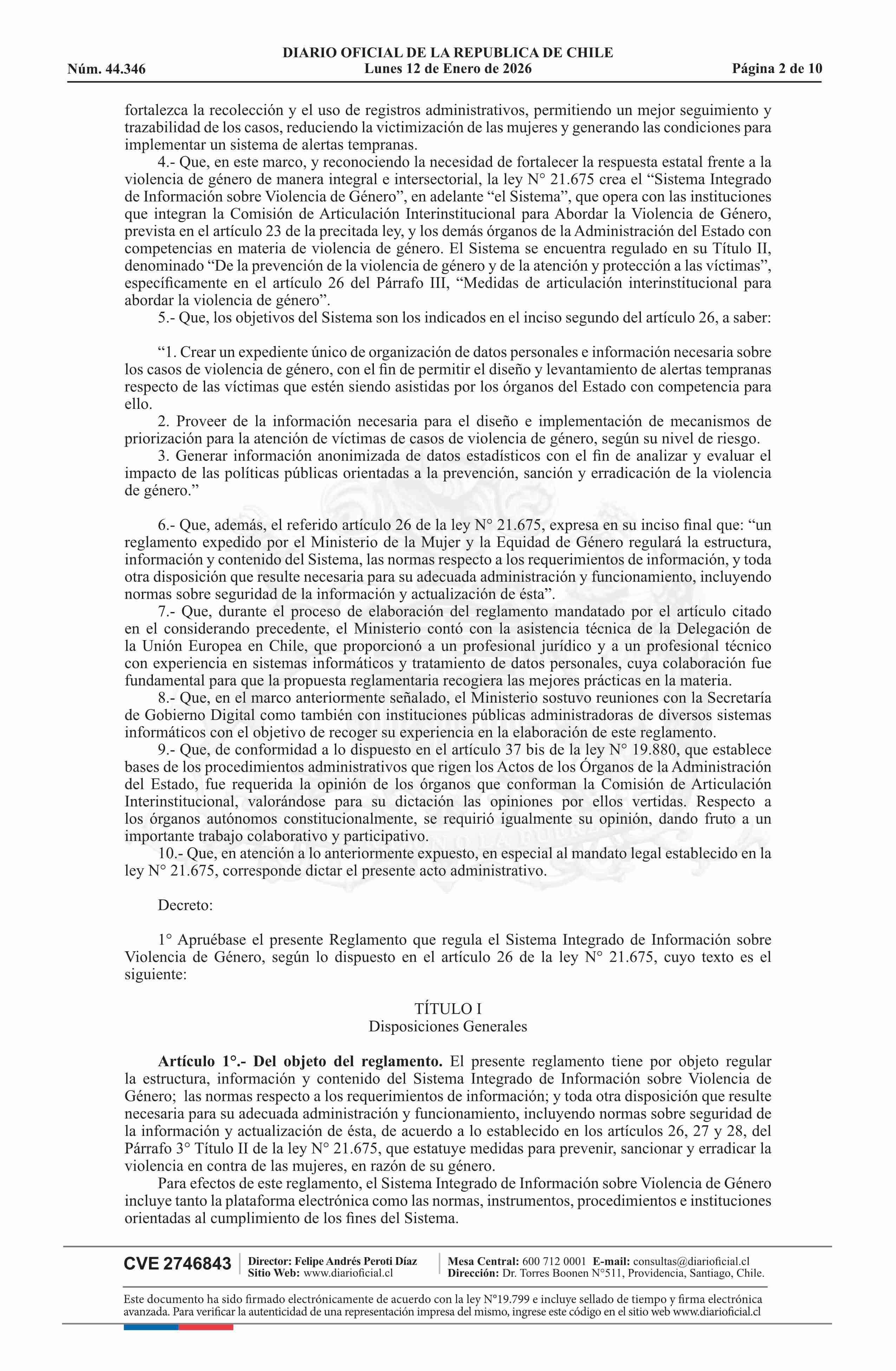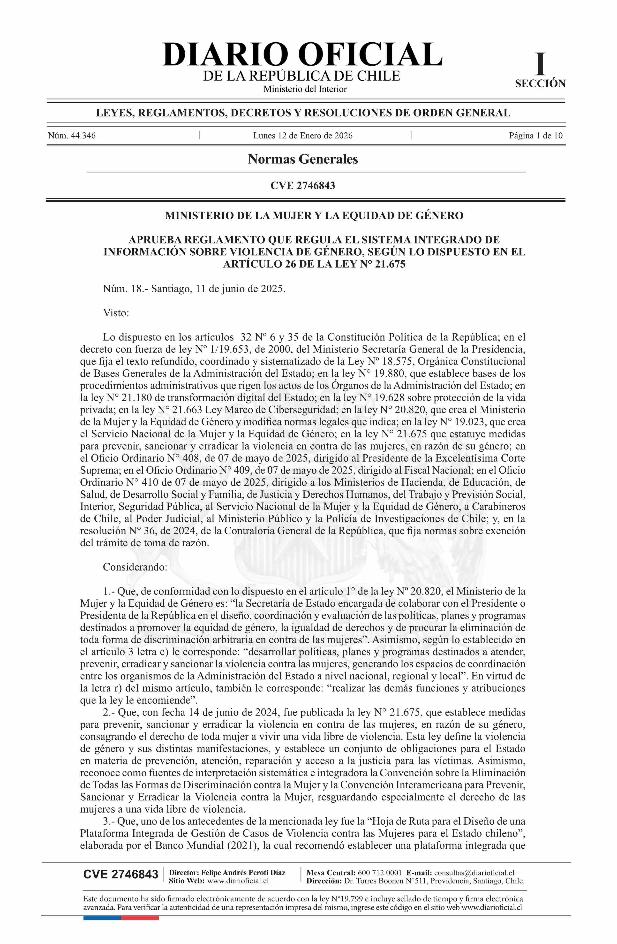 Decreto número 18, de 2025.- Aprueba Reglamento que regula el Sistema Integrado de Información sobre Violencia de Género, según lo dispuesto en el artículo 26 de la ley N° 21.675 12-01-2026 Diario Oficial Edición Electrónica |
