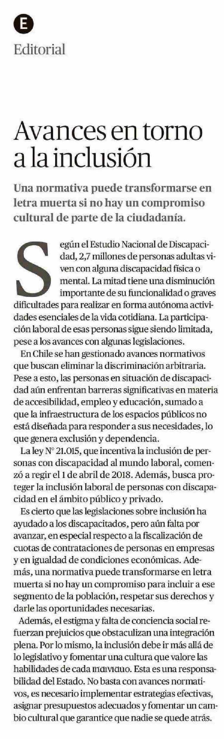 Editorial: Avances en torno a la inclusión 26-06-2025 Diario Austral Región de Los Ríos |