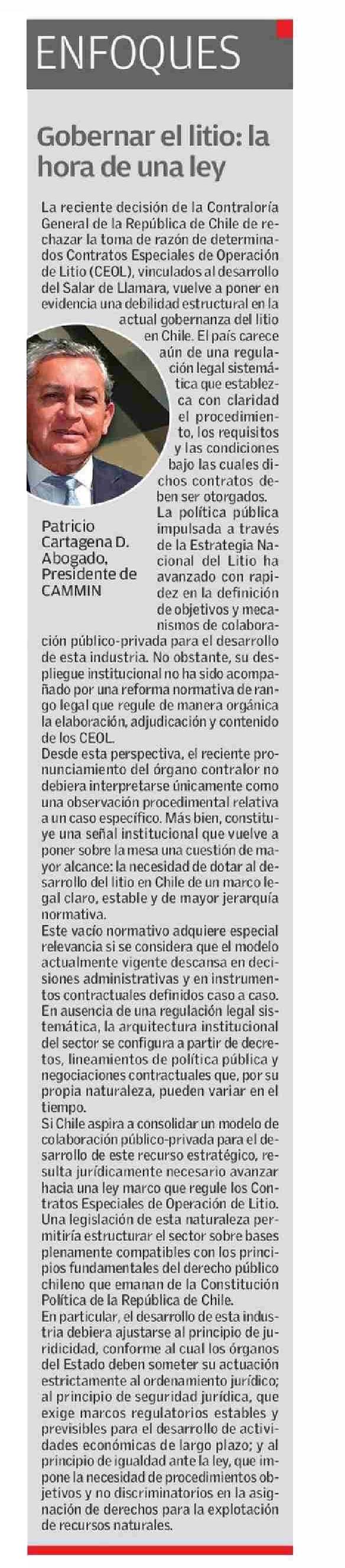 COLUMNAS DE OPINIÓN: la hora de una ley 29-03-2026 El Mercurio de Calama |