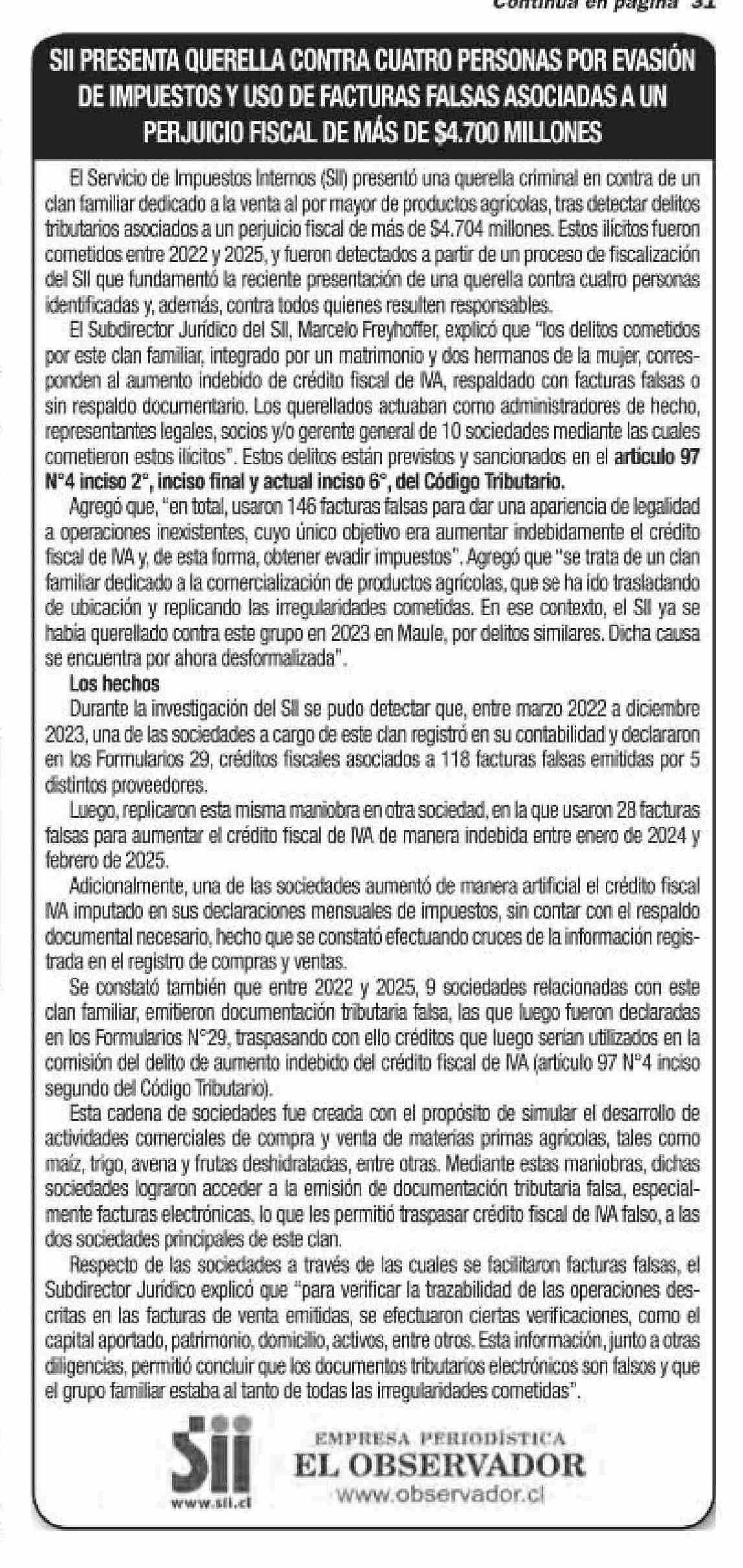 Título: Extractos: SII PRESENTA QUERELLA CONTRA CUATRO PERSONAS POR EVASIÓN DE IMPUESTOS Y USO DE FACTURAS FALSAS ASOCIADAS AUN PERJUICIO FISCAL DE MÁS DE $4.700 MILLONES